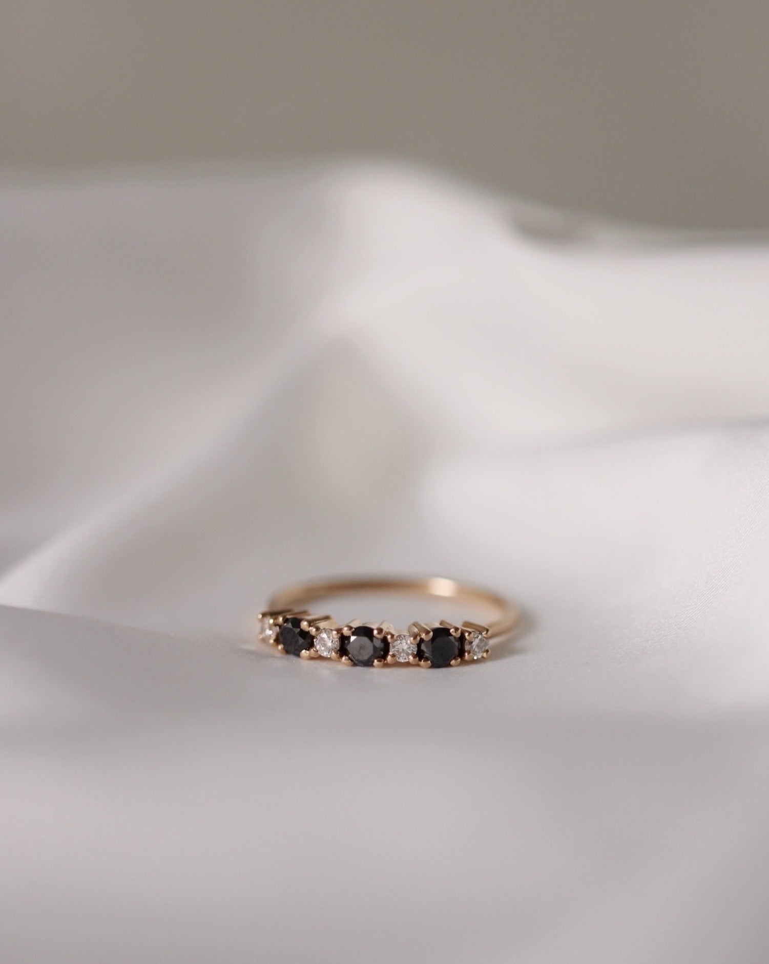 A beautiful side stone ring, with alternating smaller and larger diamonds. Beautiful and crisp with all white diamonds - but the alternating gemstones also make this design beautiful as two-toned. Simply contact us to customize your own Brigitte Ring with your choice of gemstones.