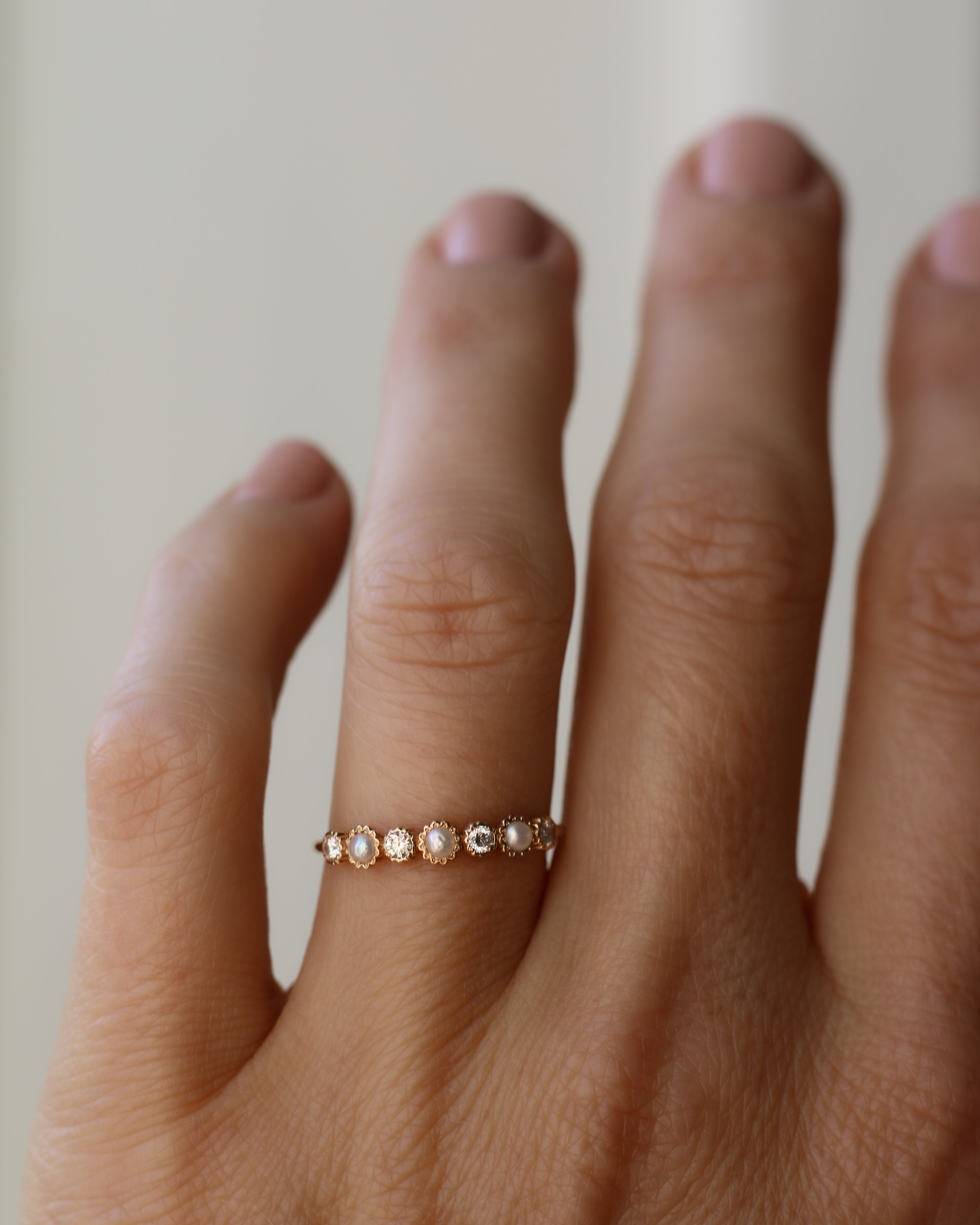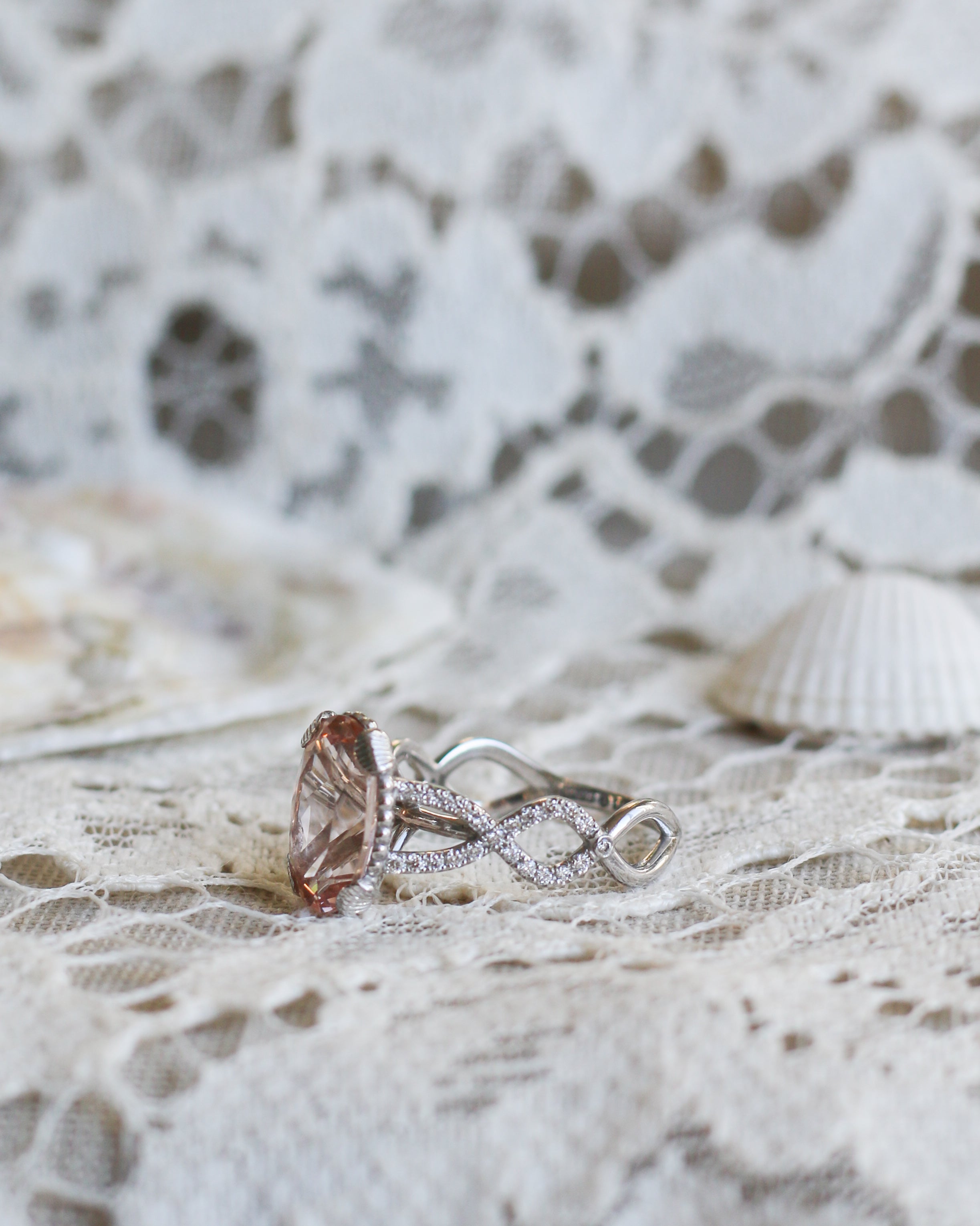 Kollektionen består av tre unika smycken: en ikonisk cocktailring med en varm, champagnerosa morganit i centrum, ett matchande örhänge samt en soiréering – alla med designinslag som för tankarna till havets vågor och Valeries signatursymbol: snäckan.