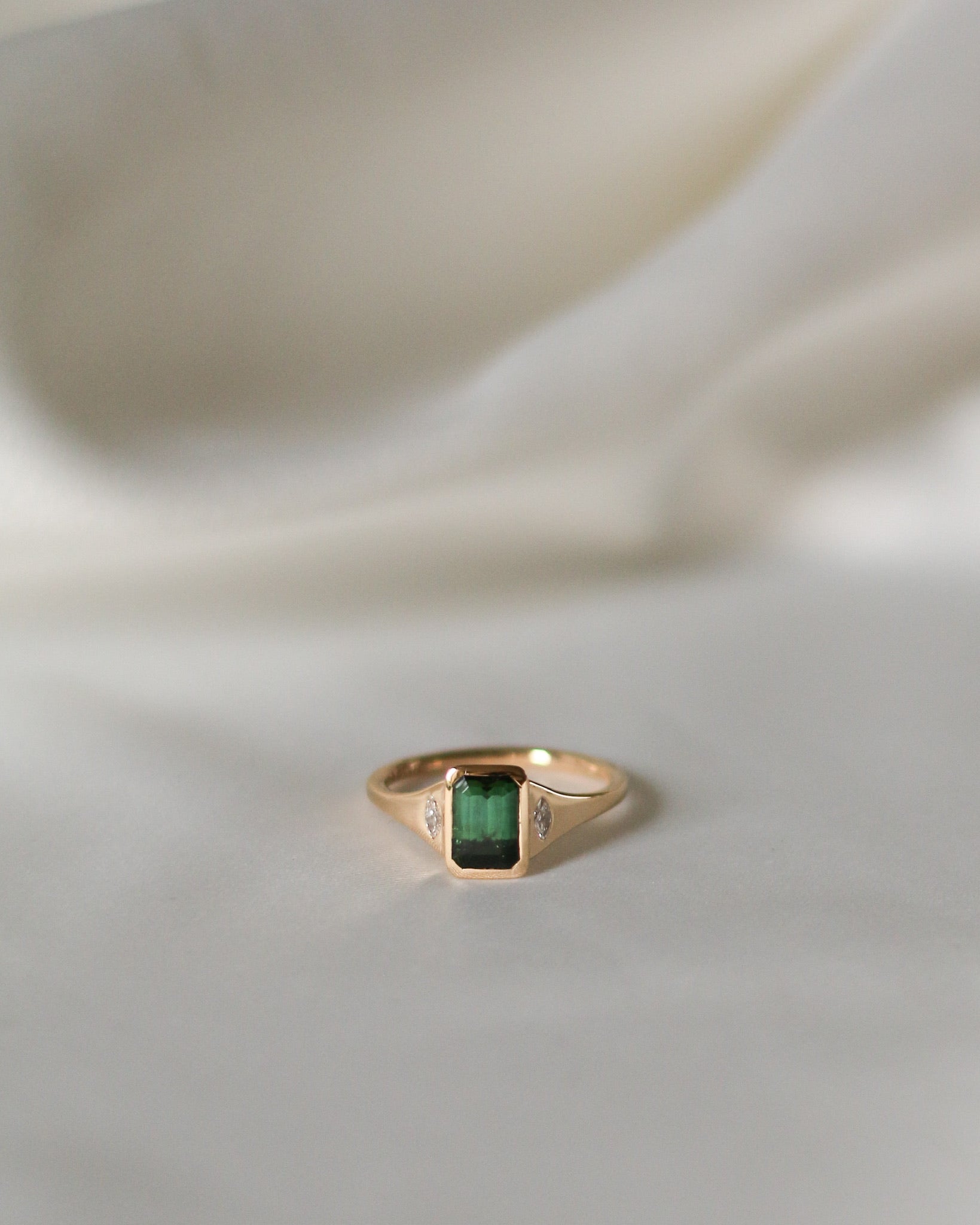 Solitaire Ring with Dark Green Emerald-Cut Tourmaline and Marquise-Cut Diamonds