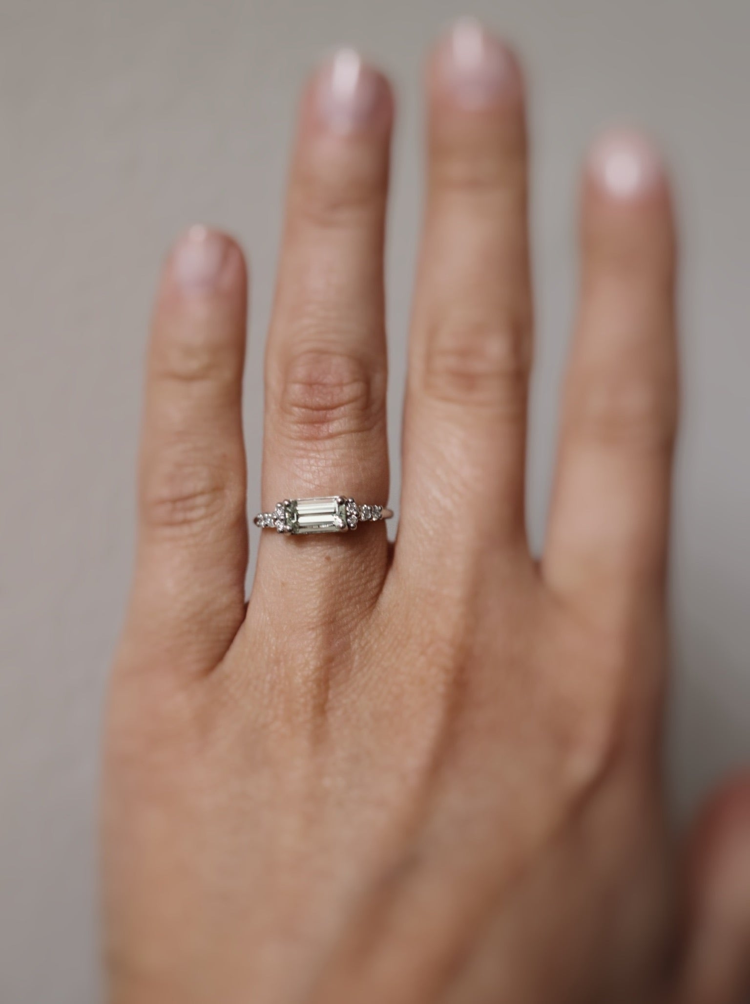 She wanted a real power ring to be able to use all year round. She was looking for a gemstone that had a very faded colour tone - bordering on colourless - so that it would blend in as much as possible and not brightly stand out too much.