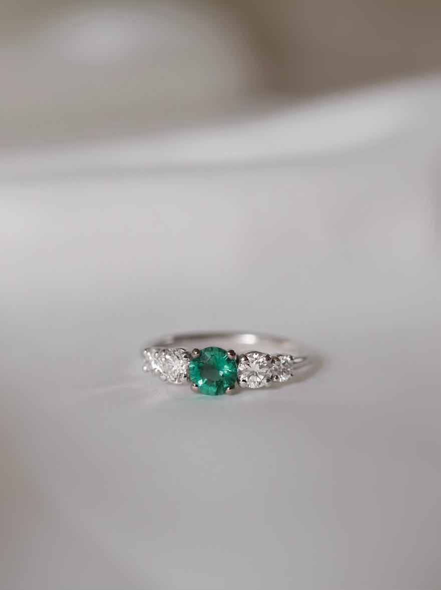 An electric green 0.41 CT/5 mm Emerald flanked by very high quality white diamonds