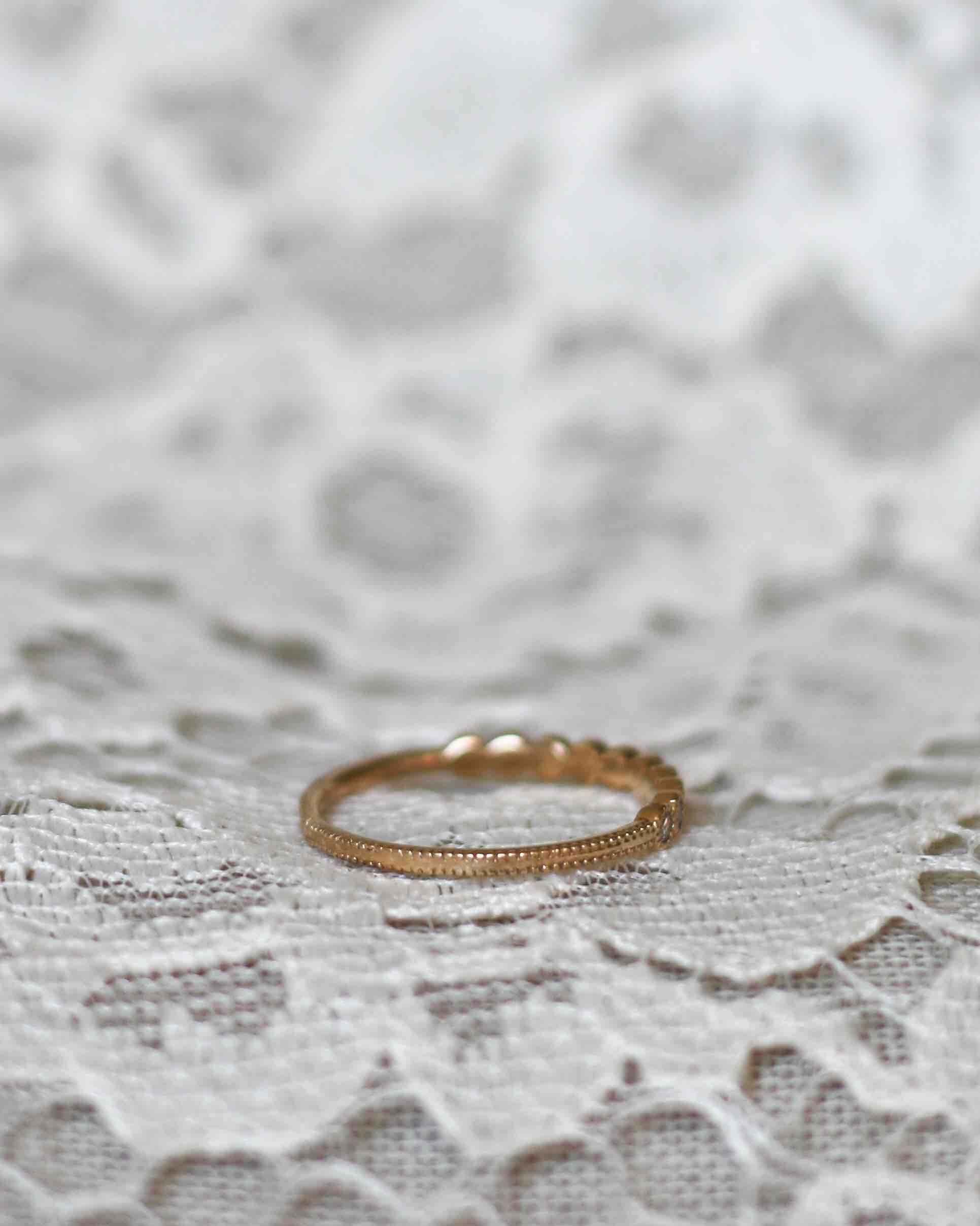 It features the characteristic, delicate milgrain decor of small gold dots that was popular in the early 1900s.