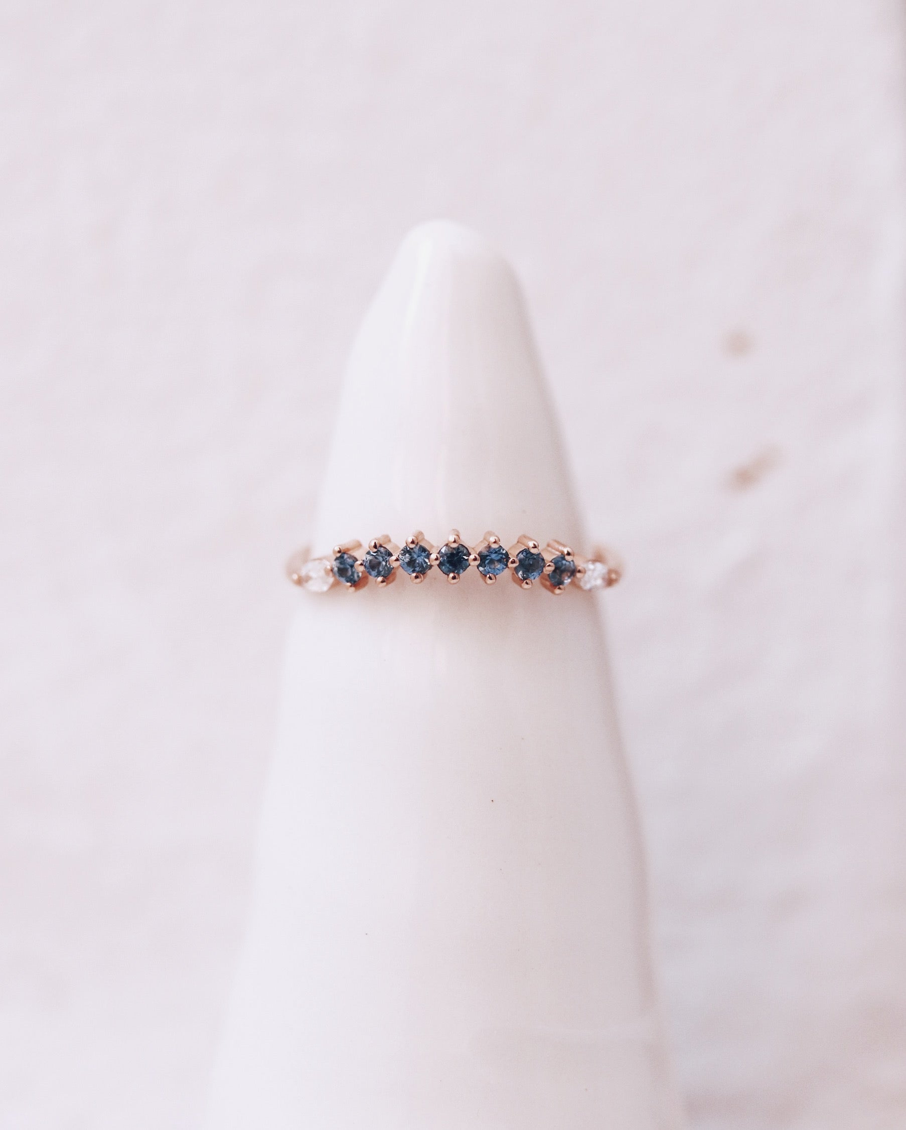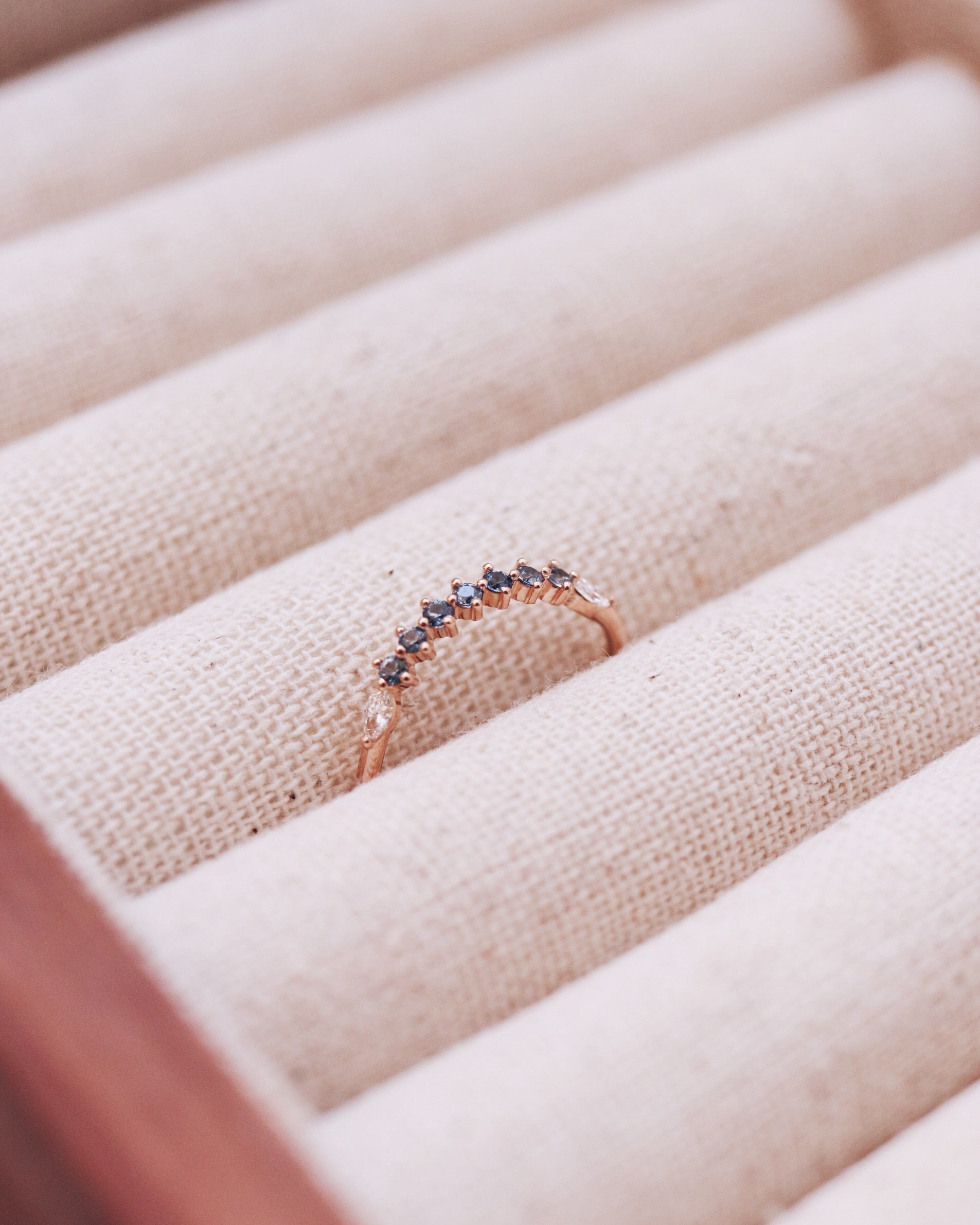 The ring you can bid on is the beautiful Idun Curved Diamond Band with light blue sapphires and diamonds.