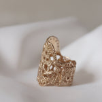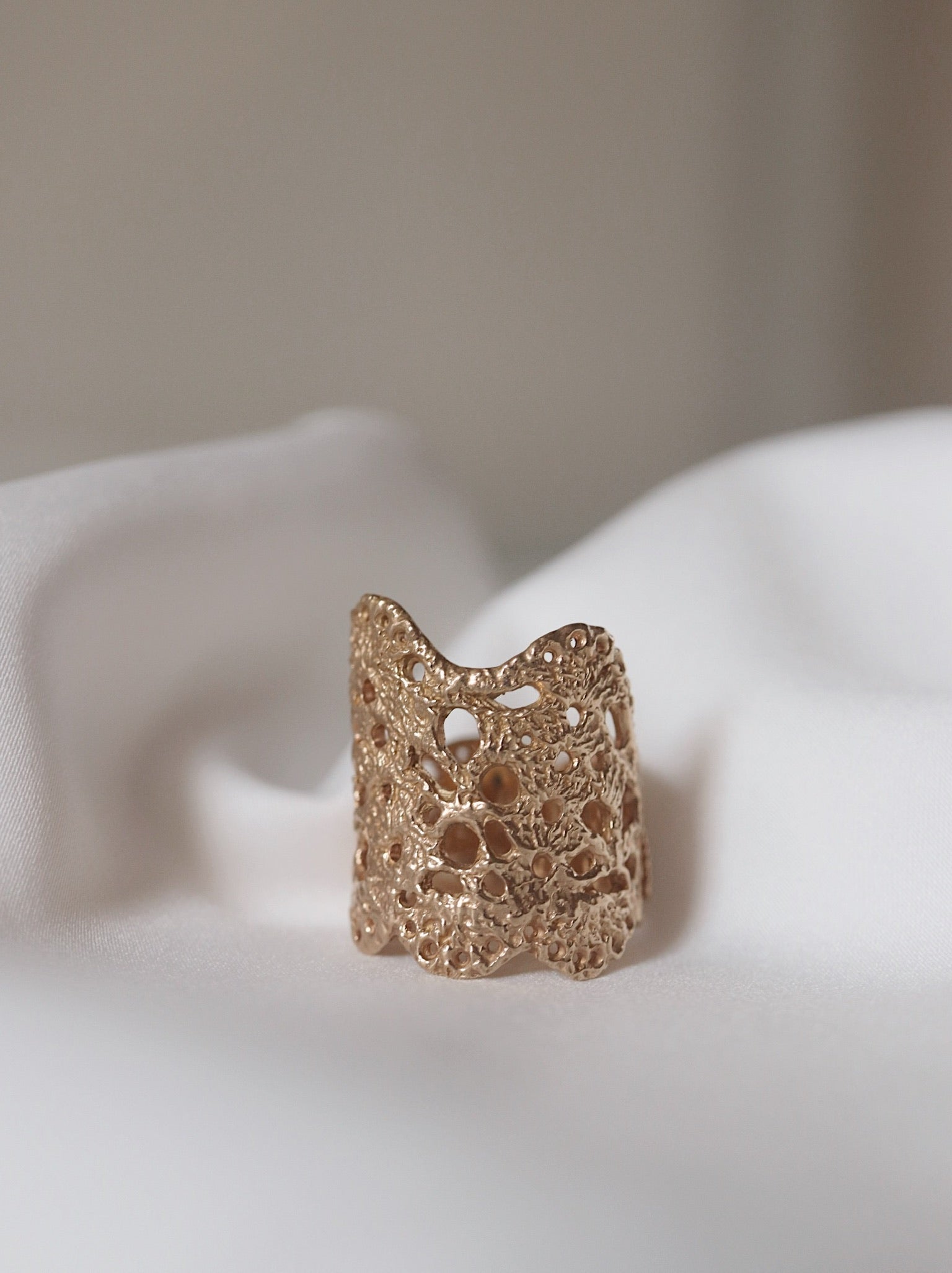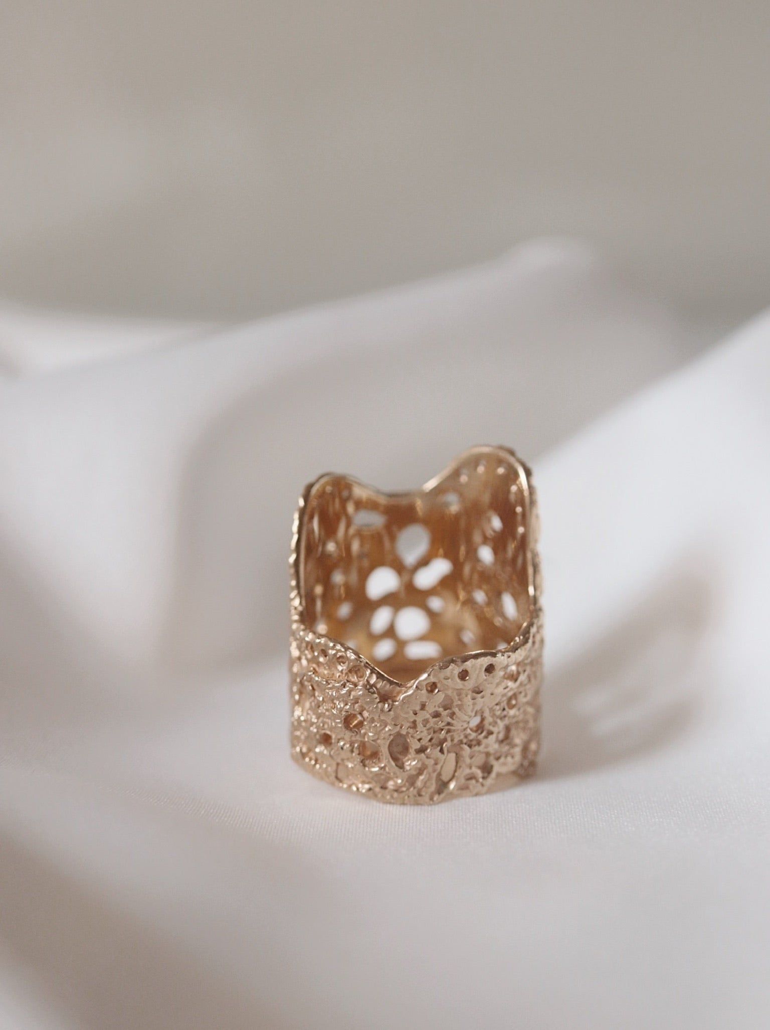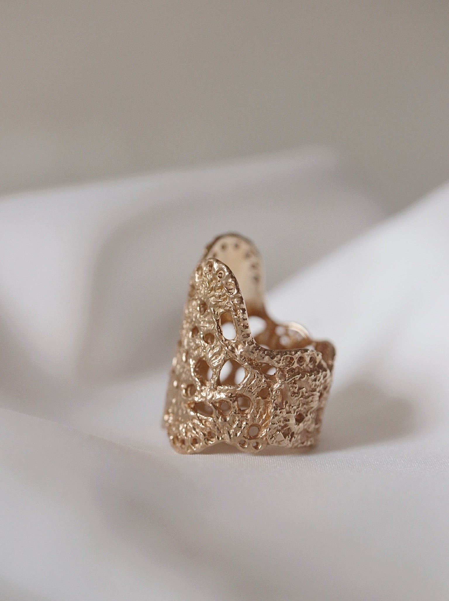 This is my most personal ring so far. Created from my grandmother's handknitted lace, this ring took 1,5 year to develop. Her name was Maria Cecilia which is why I decided to call it Cecilia Lace Ring.