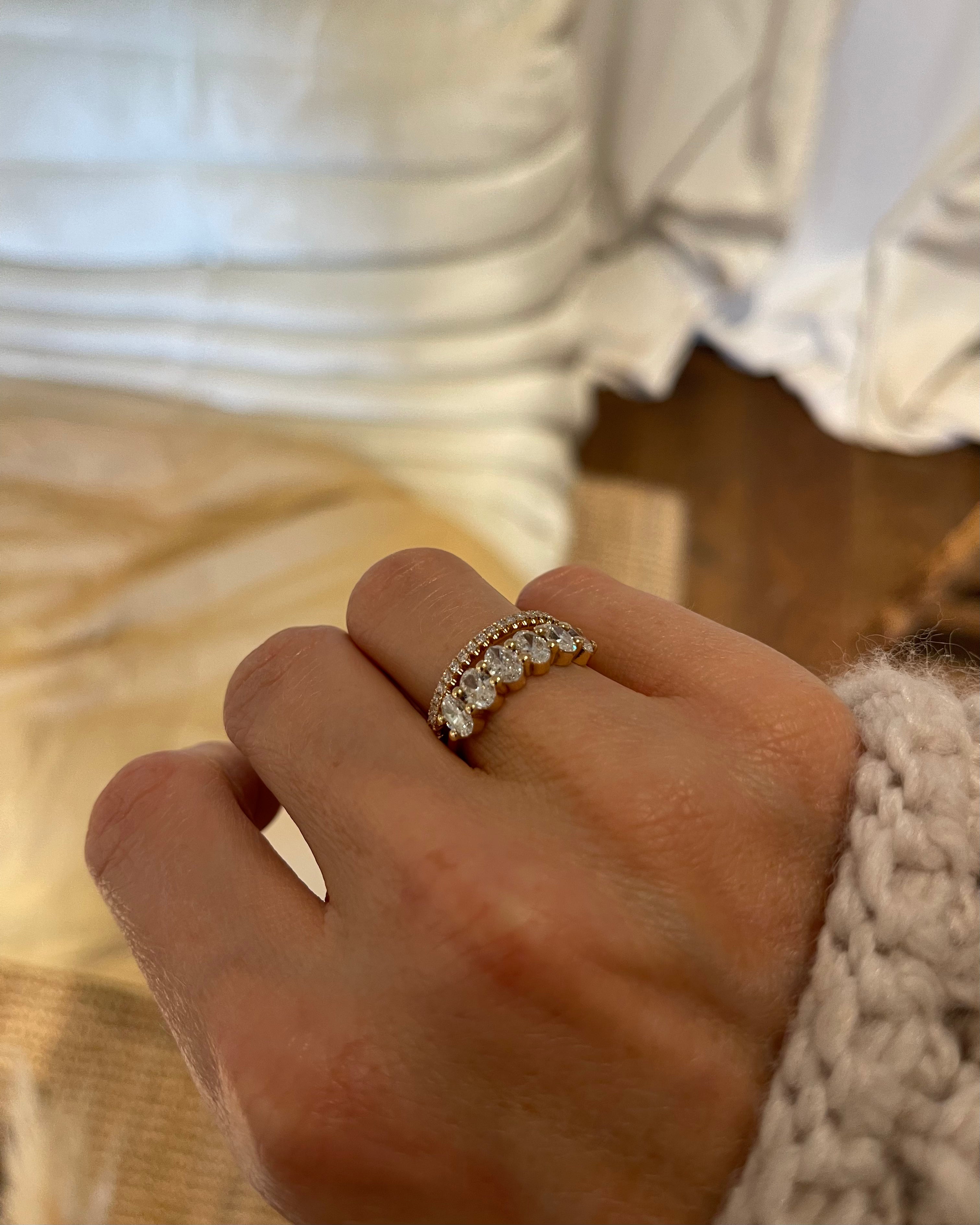 The ring on the picture is in size 17,25/54 and is fully covered with 45 diamonds, in total 0.45 CT.