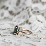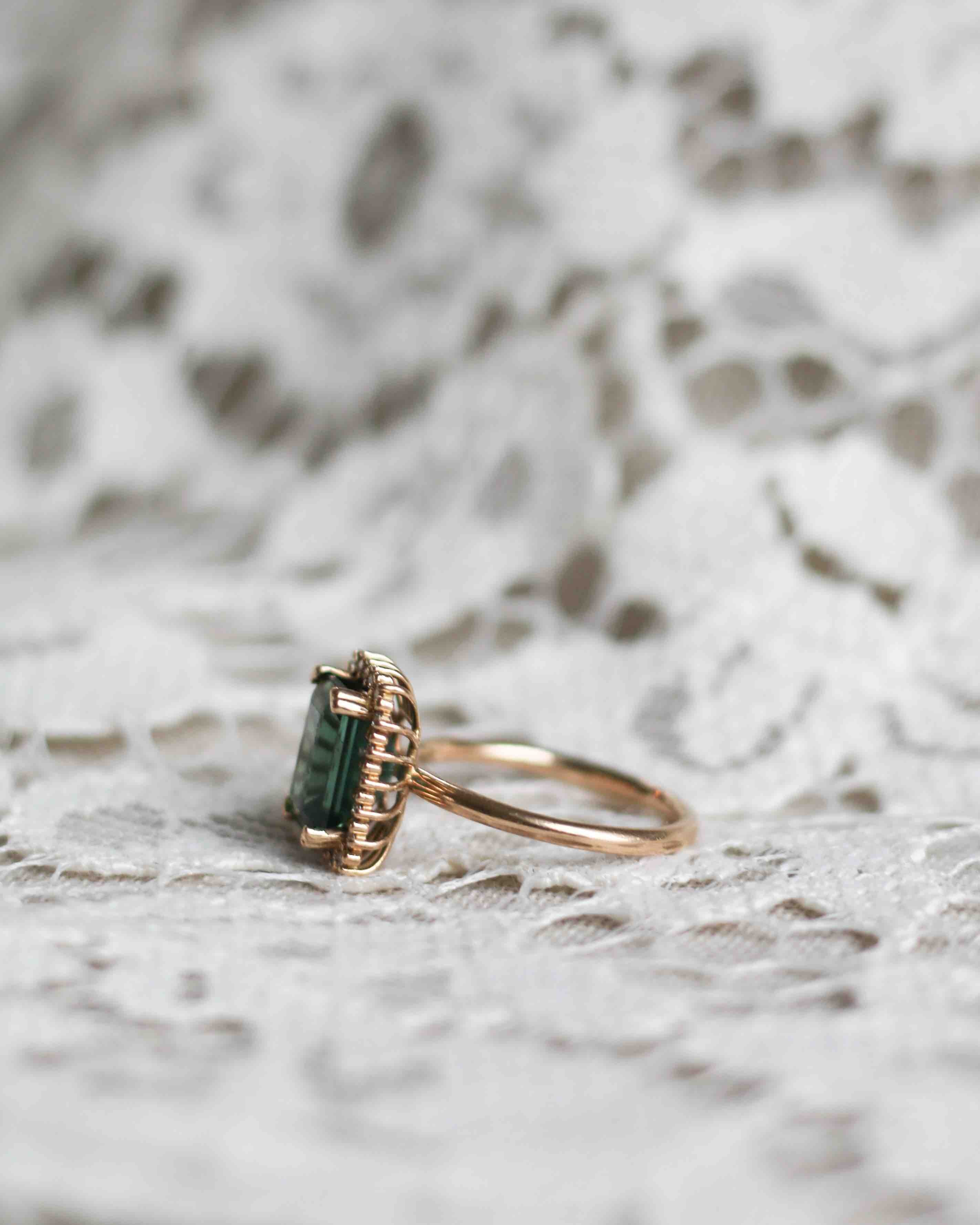 The stunning tourmaline used in this ring is in a perfect shade of dark green and has a beautiful clarity. It has been expertly cut into an exclusive emerald cut.