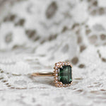 Solitaire Ring with Dark Green Tourmaline and Diamond Halo