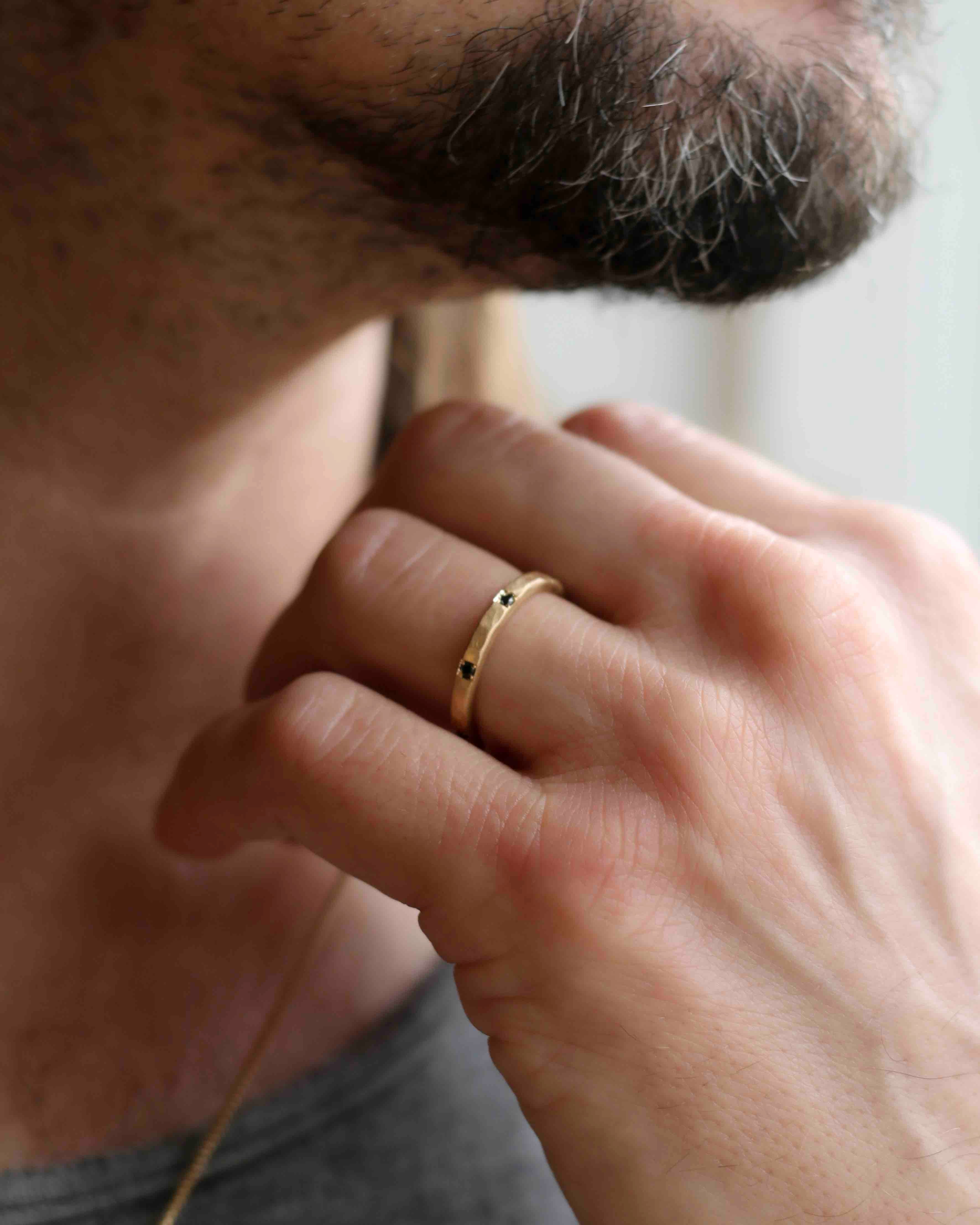 Logan Eternity Band is a relatively narrow ring, only 2.5 mm wide, but thanks to its rustic surface and ample height, it feels solid and is incredibly comfortable to wear.