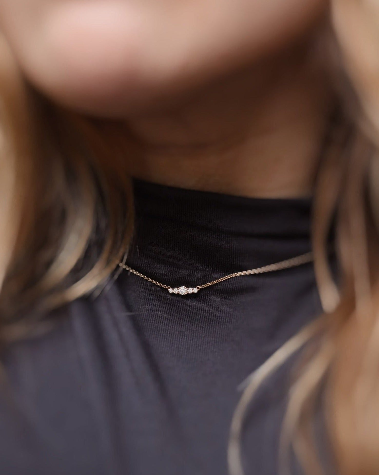 The five diamonds are set in a delicate, symmetric setting that glimmers beautifully just above your keybones.