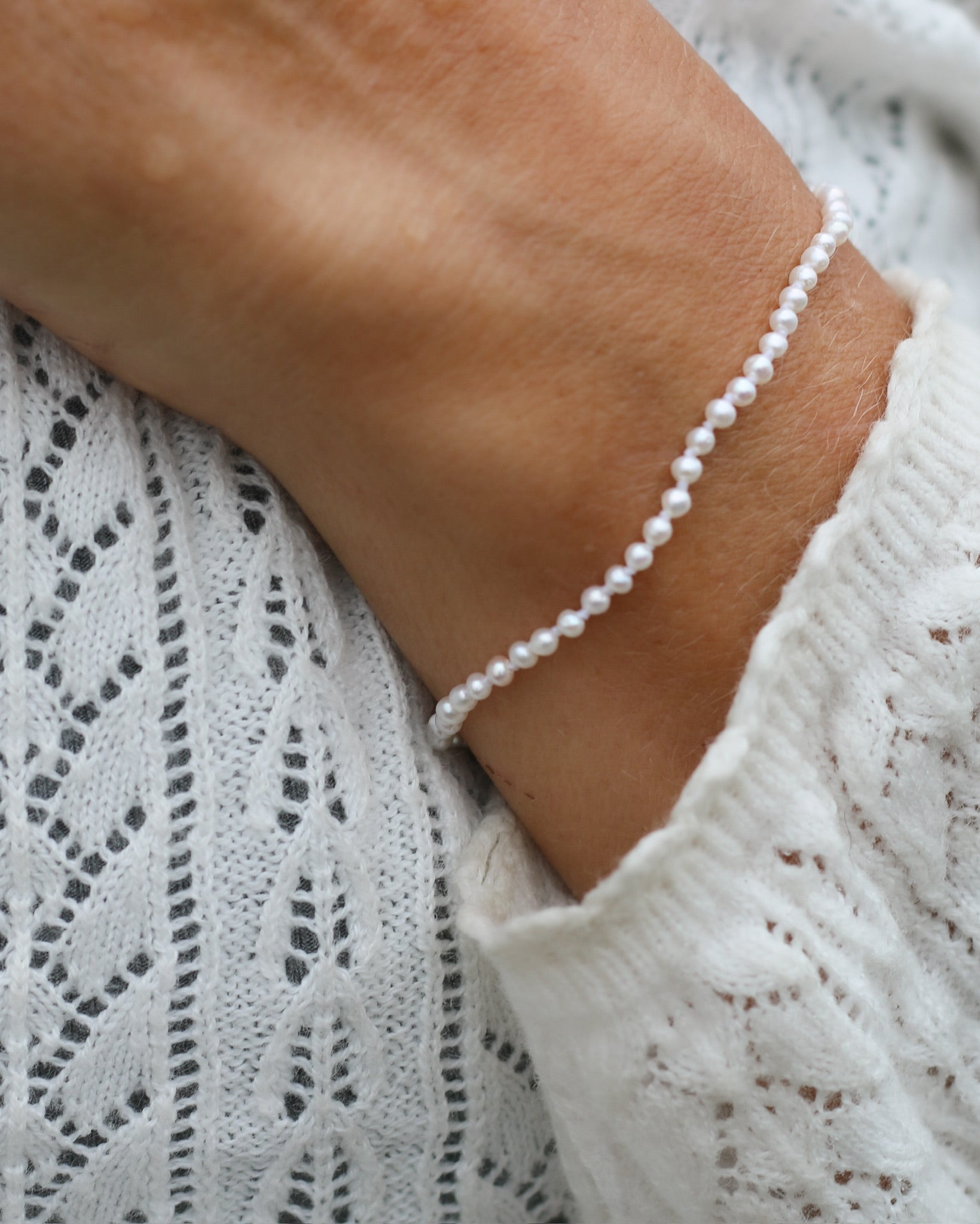 The bracelet is tied by hand in Sweden using 2,5 mm freshwater pearls