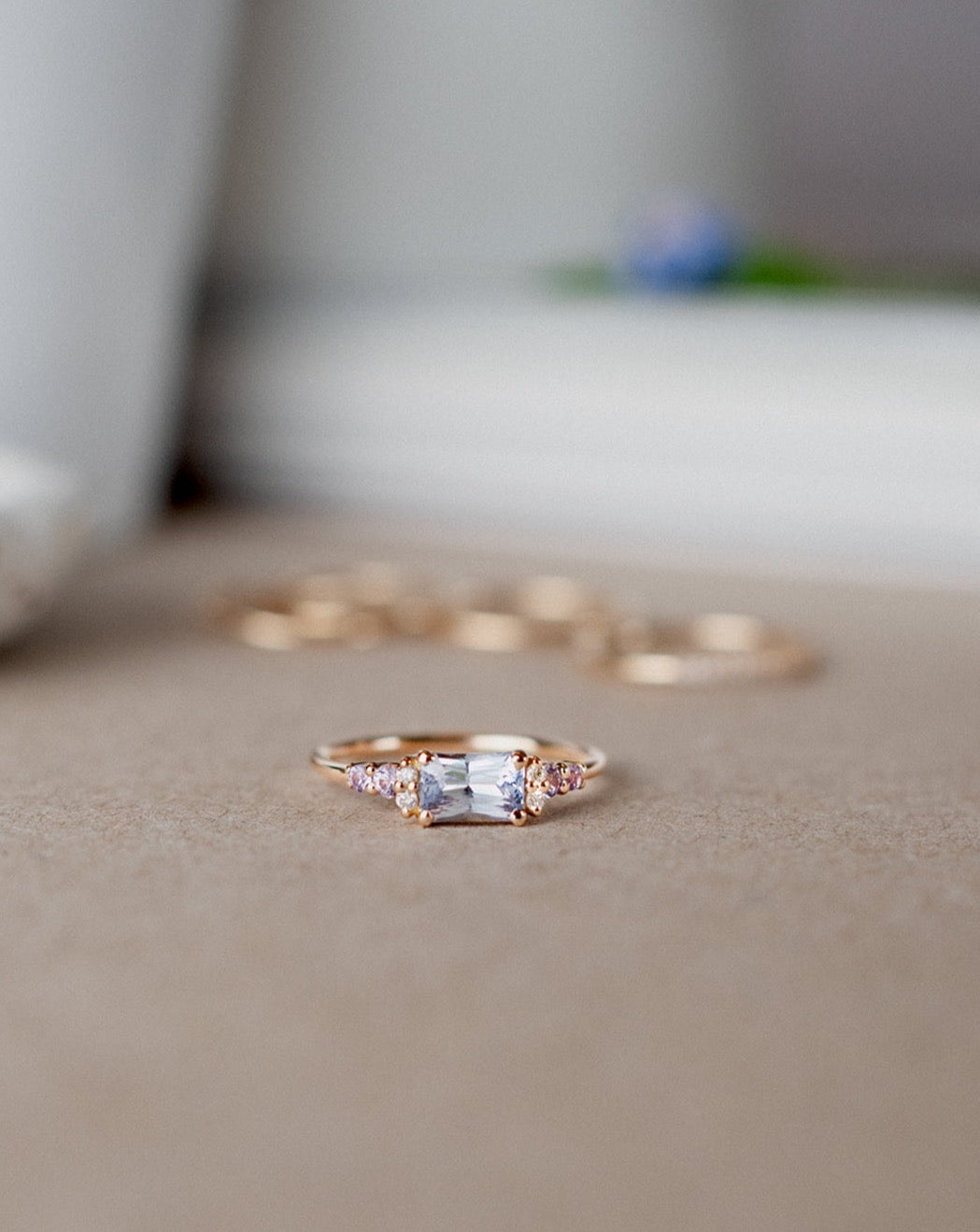 A unique, beautiful cluster ring with a lovely light blue sapphire, combined with lavender sapphires and diamonds. The light blue sapphire has a faceted radiant-cut making it utterly sparkling.