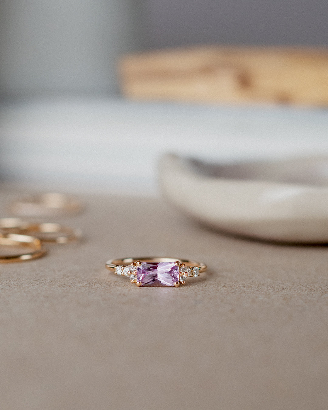 A beautiful one-of-a-kind cluster ring in a bold yet soft colour combo of a purplish pink sapphire and grey and white diamonds.