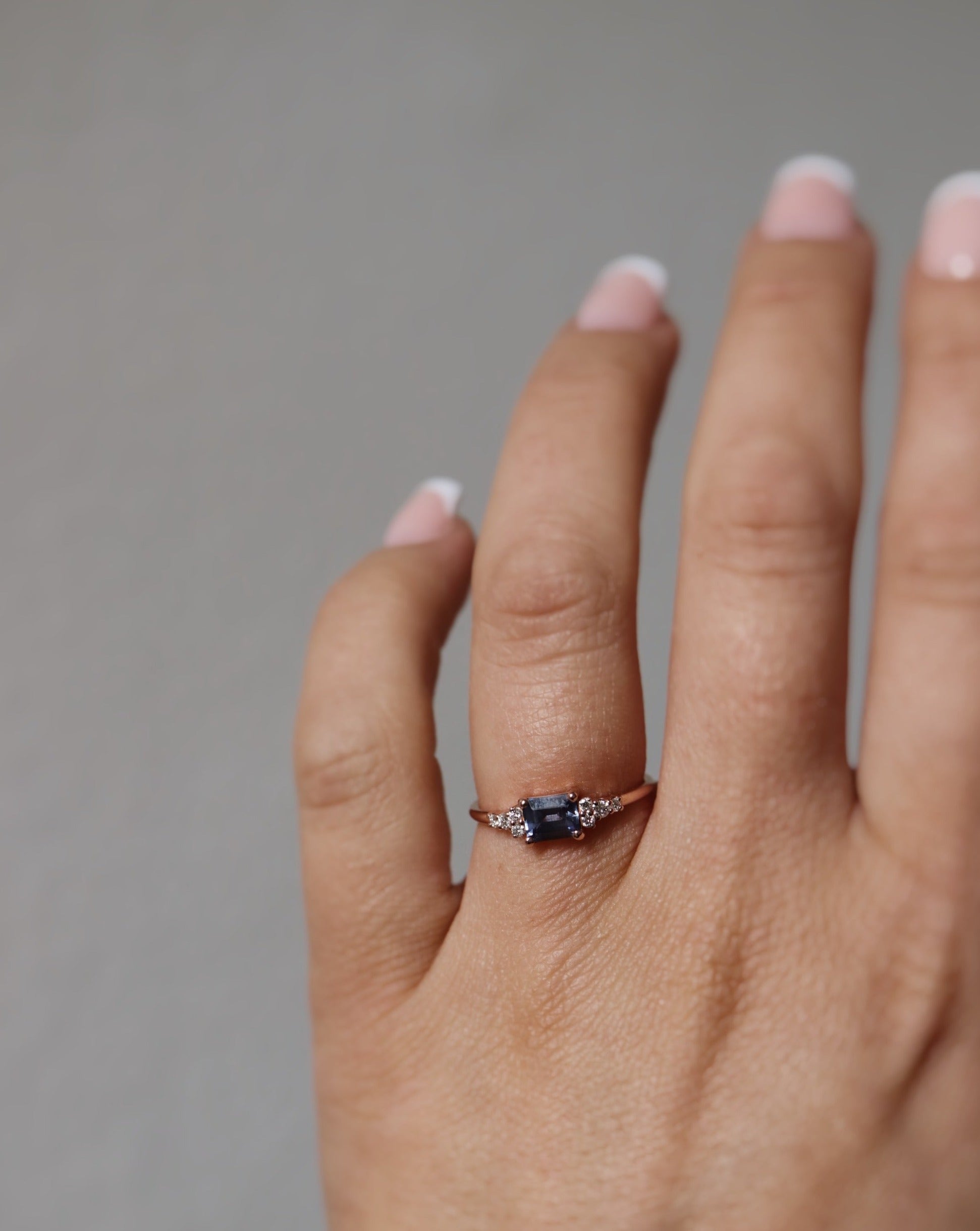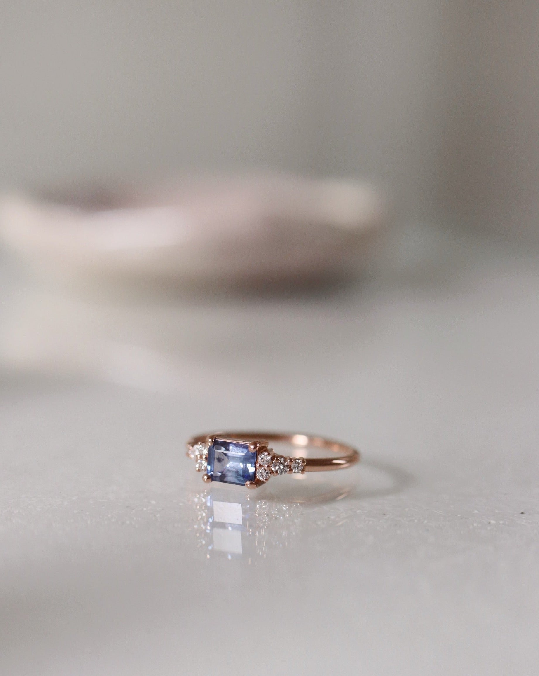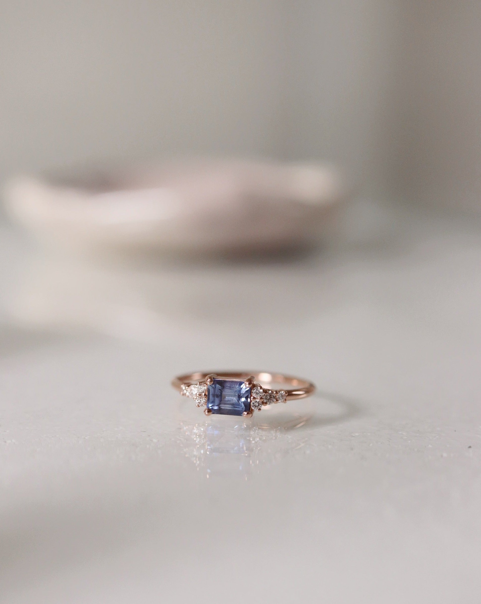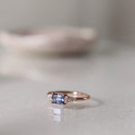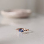 This lovely 0.59 CT sapphire has a luxurious emerald cut and a stunning blue tone with violet hints. In the ring we have enchanted the color of the sapphire by surrounding it with crispy white diamonds and pairing the gemstones with 18K Rose Gold.