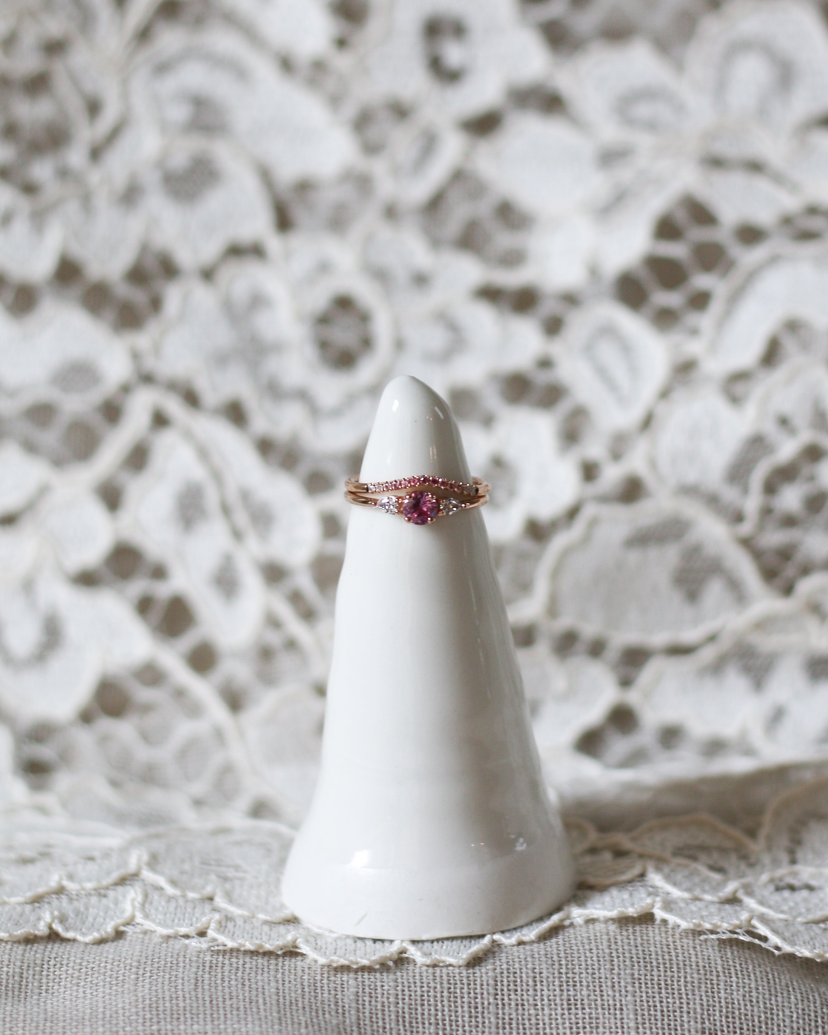 Drop Edith Ring looks amazing alone on the ring finger. It also stacks beautifully with other rings, especially curved bands.