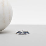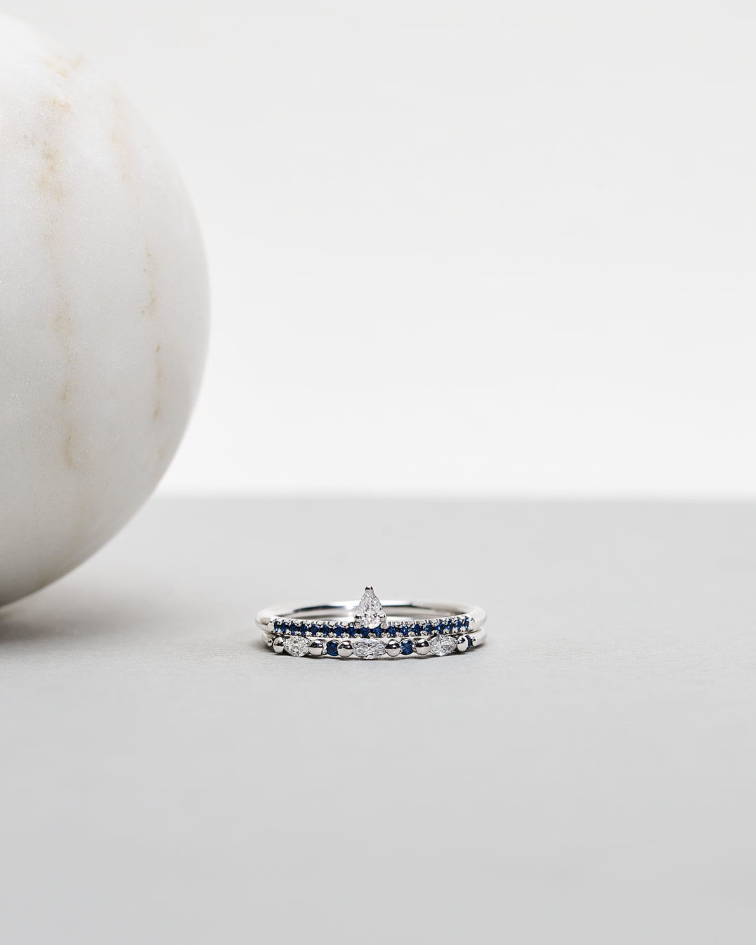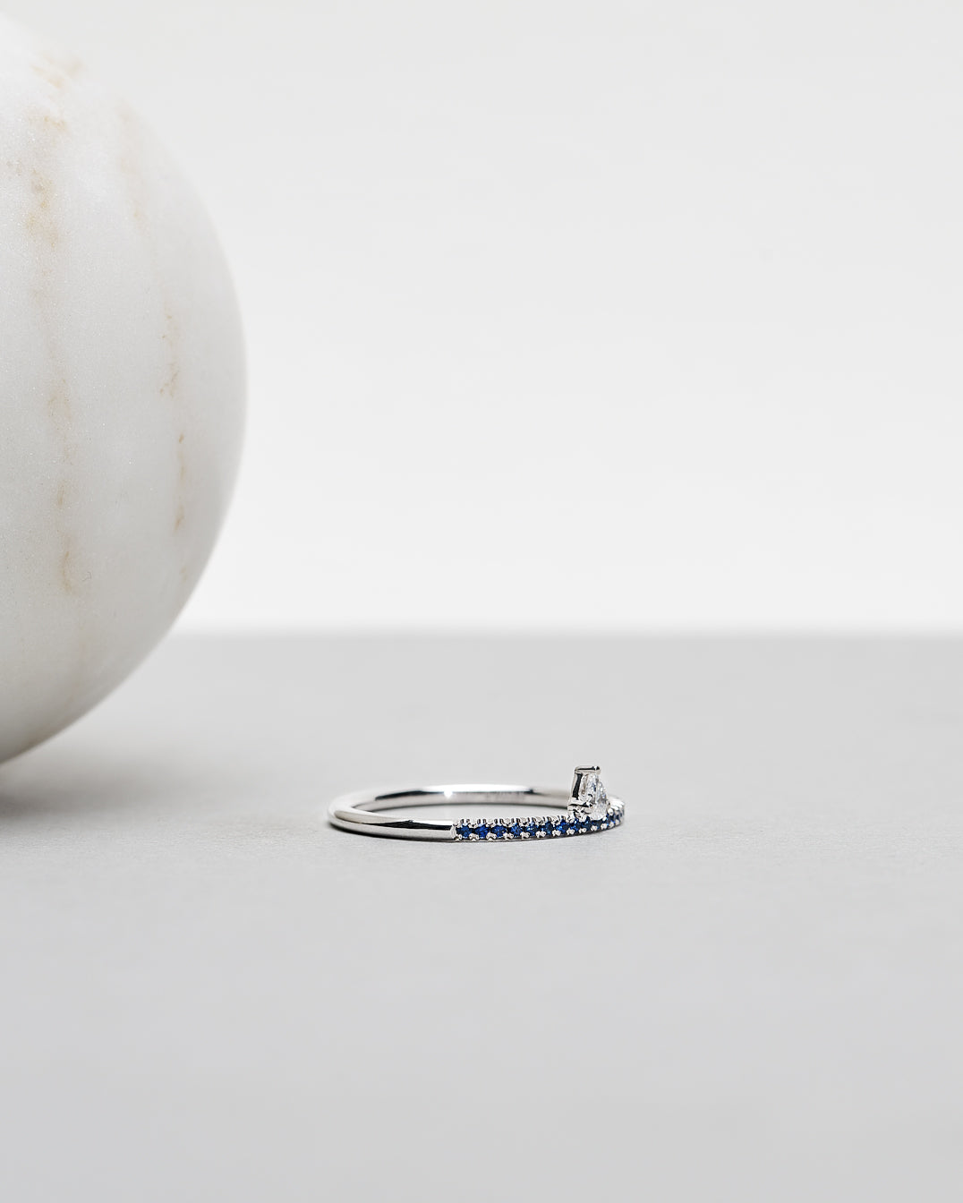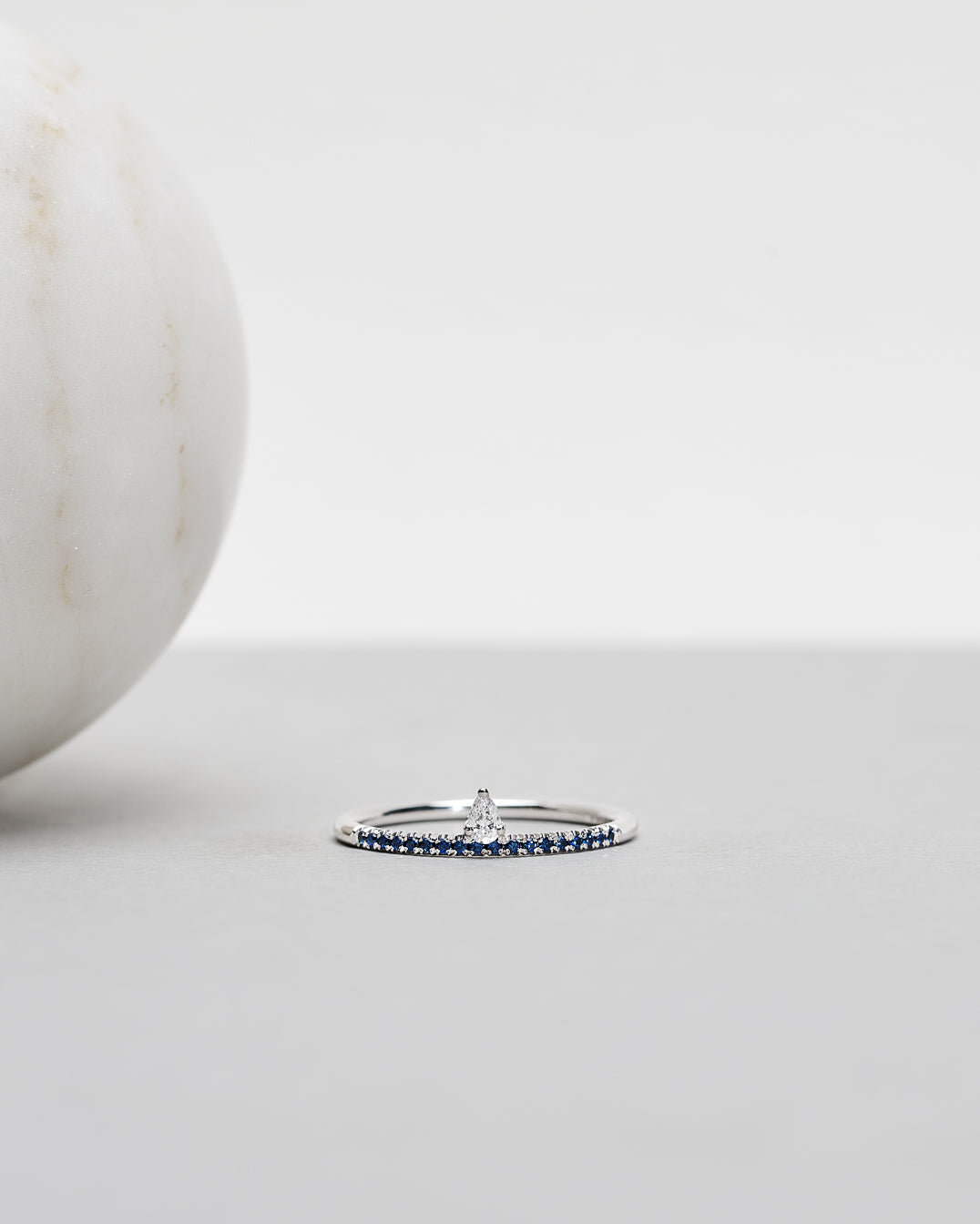 - Lily Tiny Diamond Drop Ring in White Gold with Dark Blue Sapphire Row