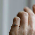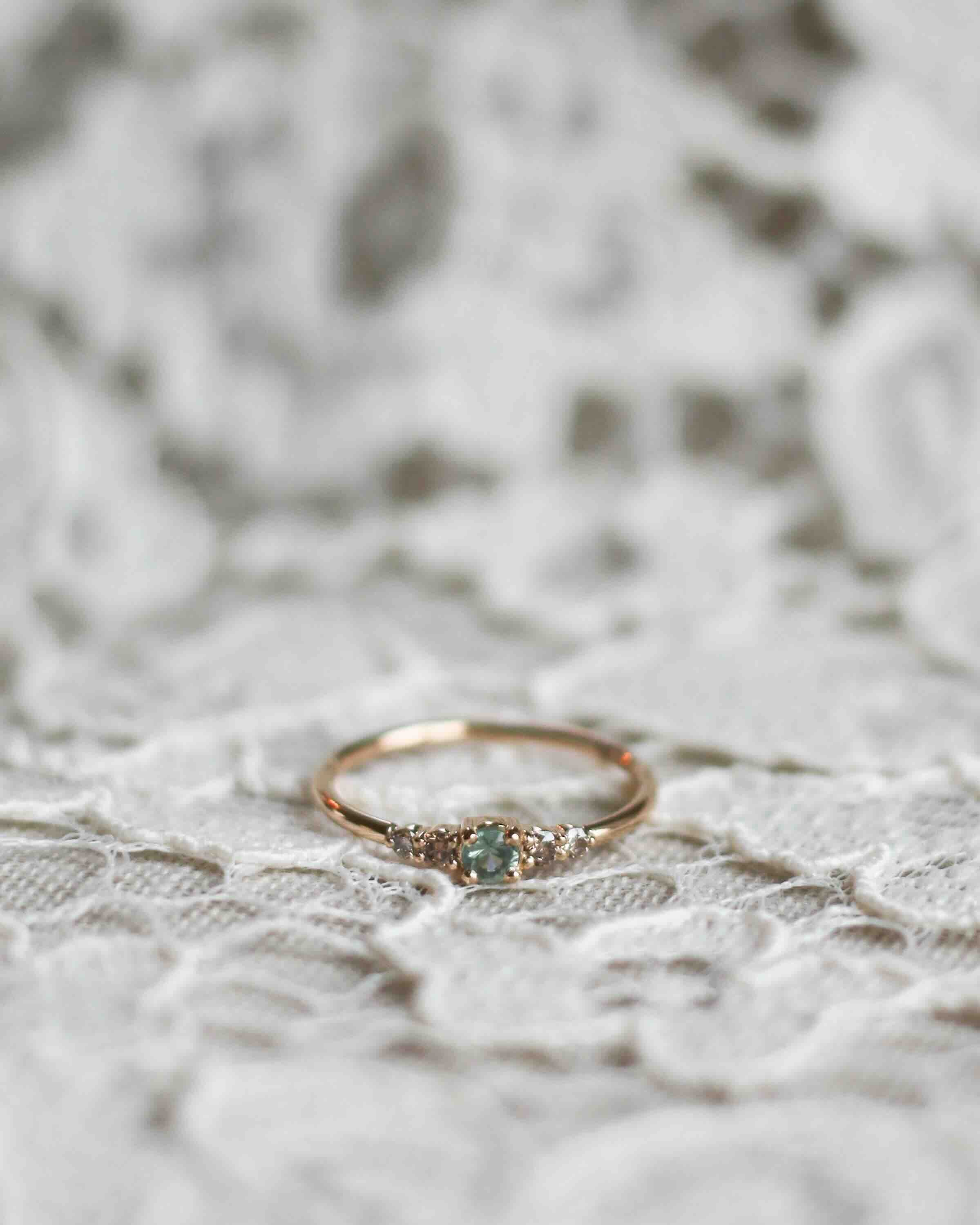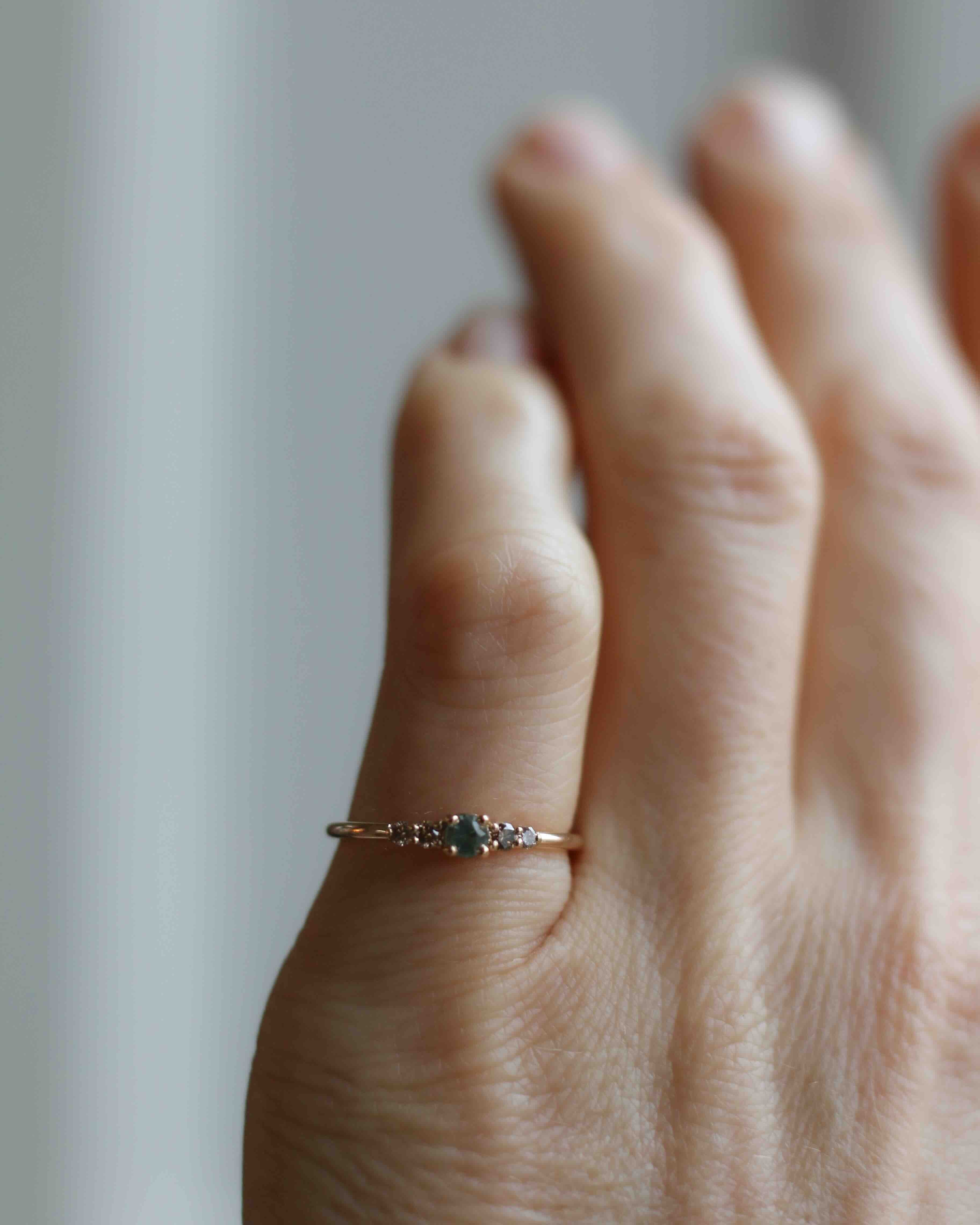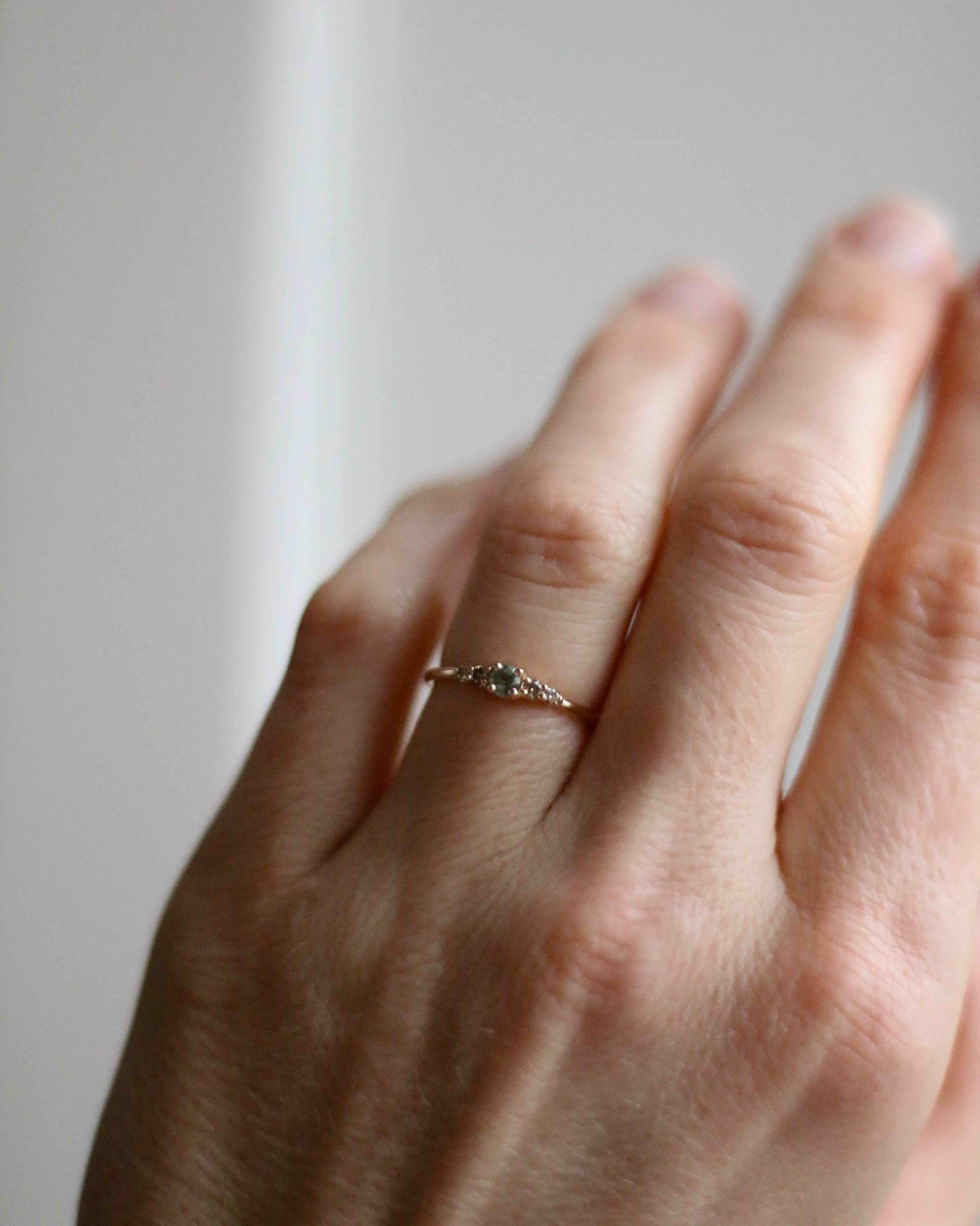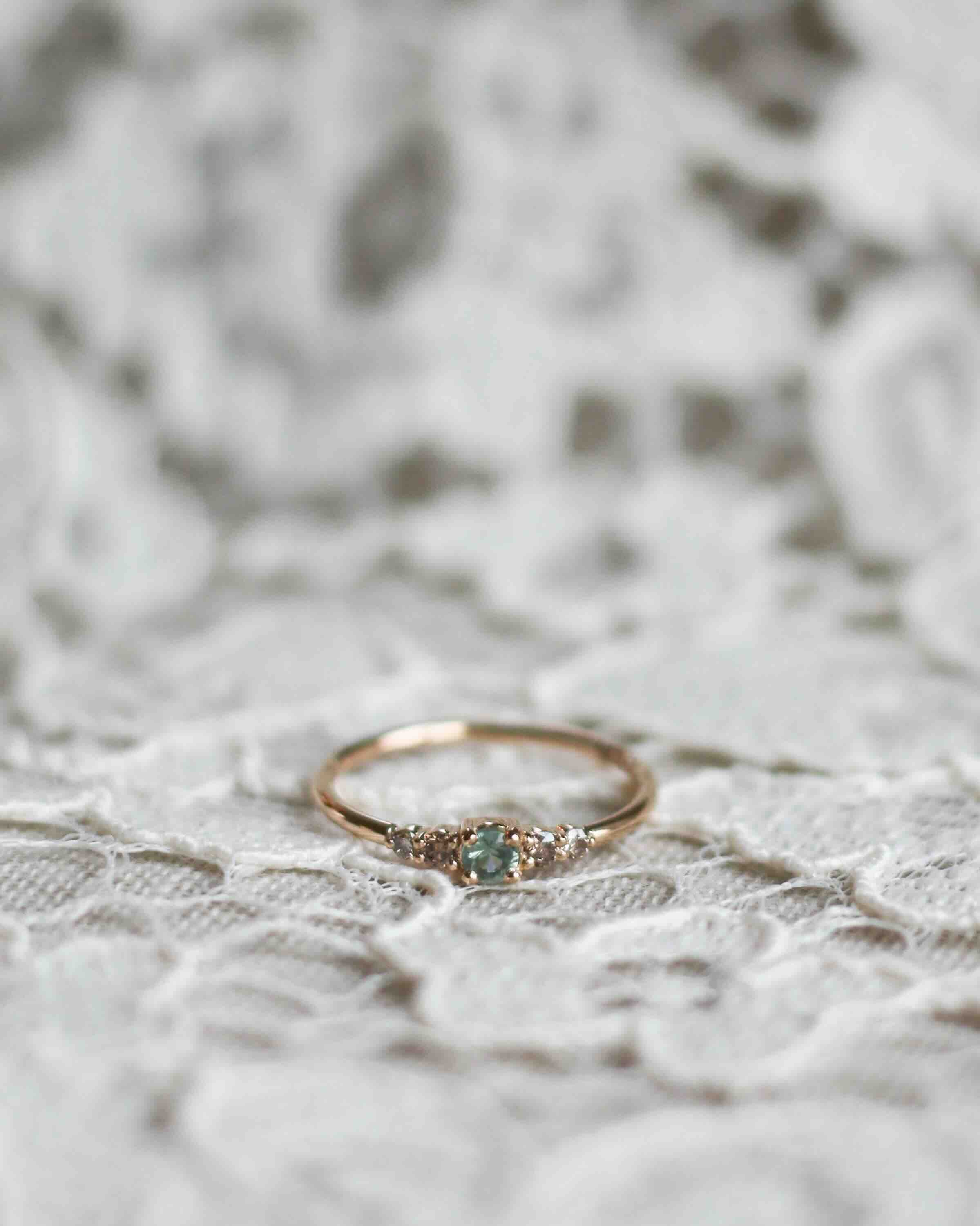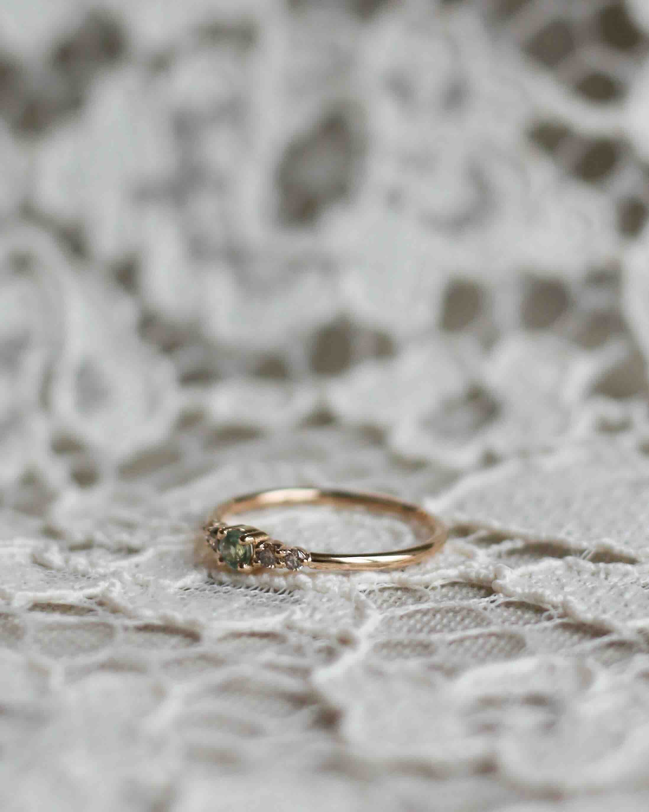 This one features a unique combination of our unique gemstone - the natural olive green sapphire from Eastern Africa - and our popular chocolate diamonds. A ring that is perfect for those who don't want too much sparkle! This has become one of our most popular gemstone combinations.
