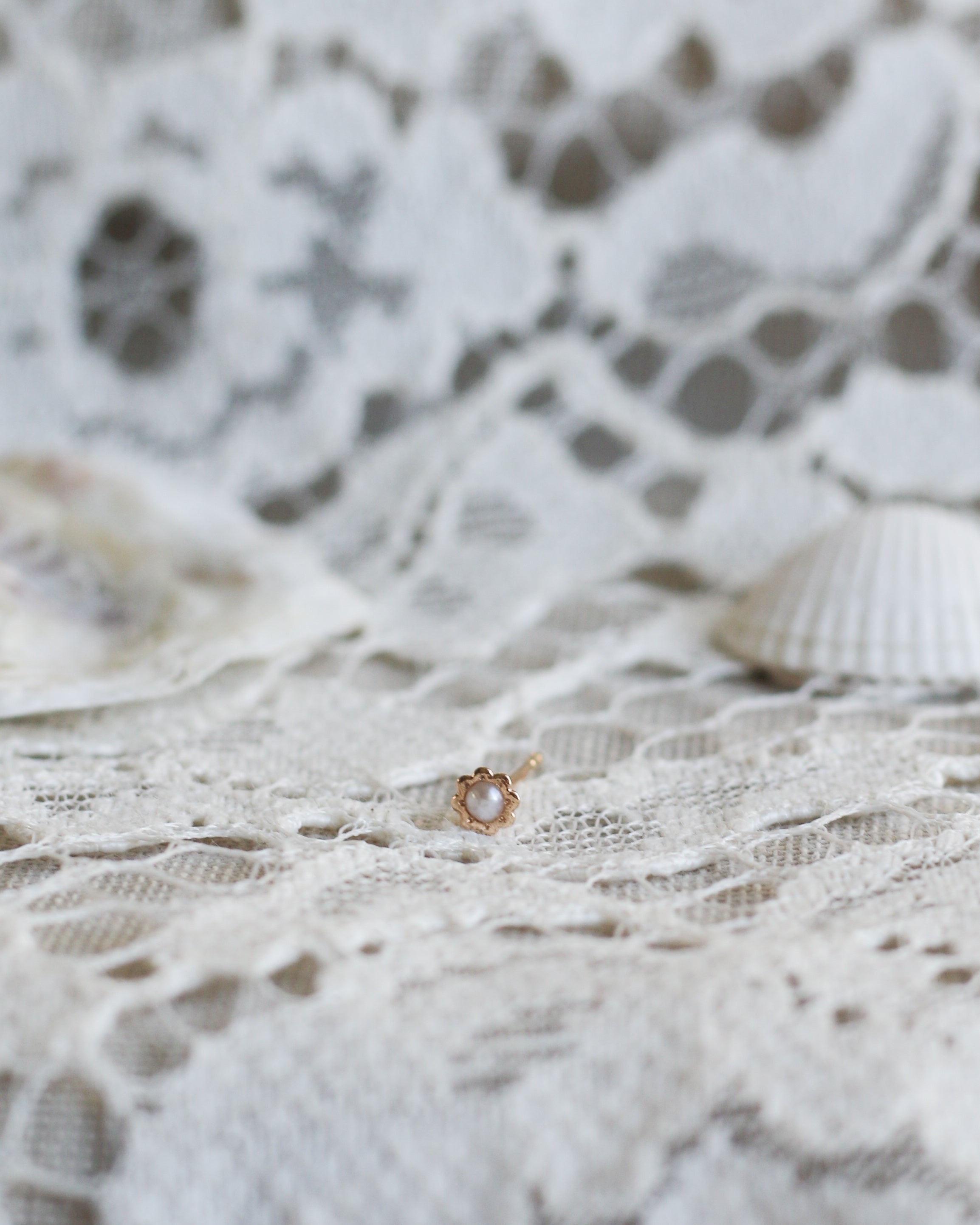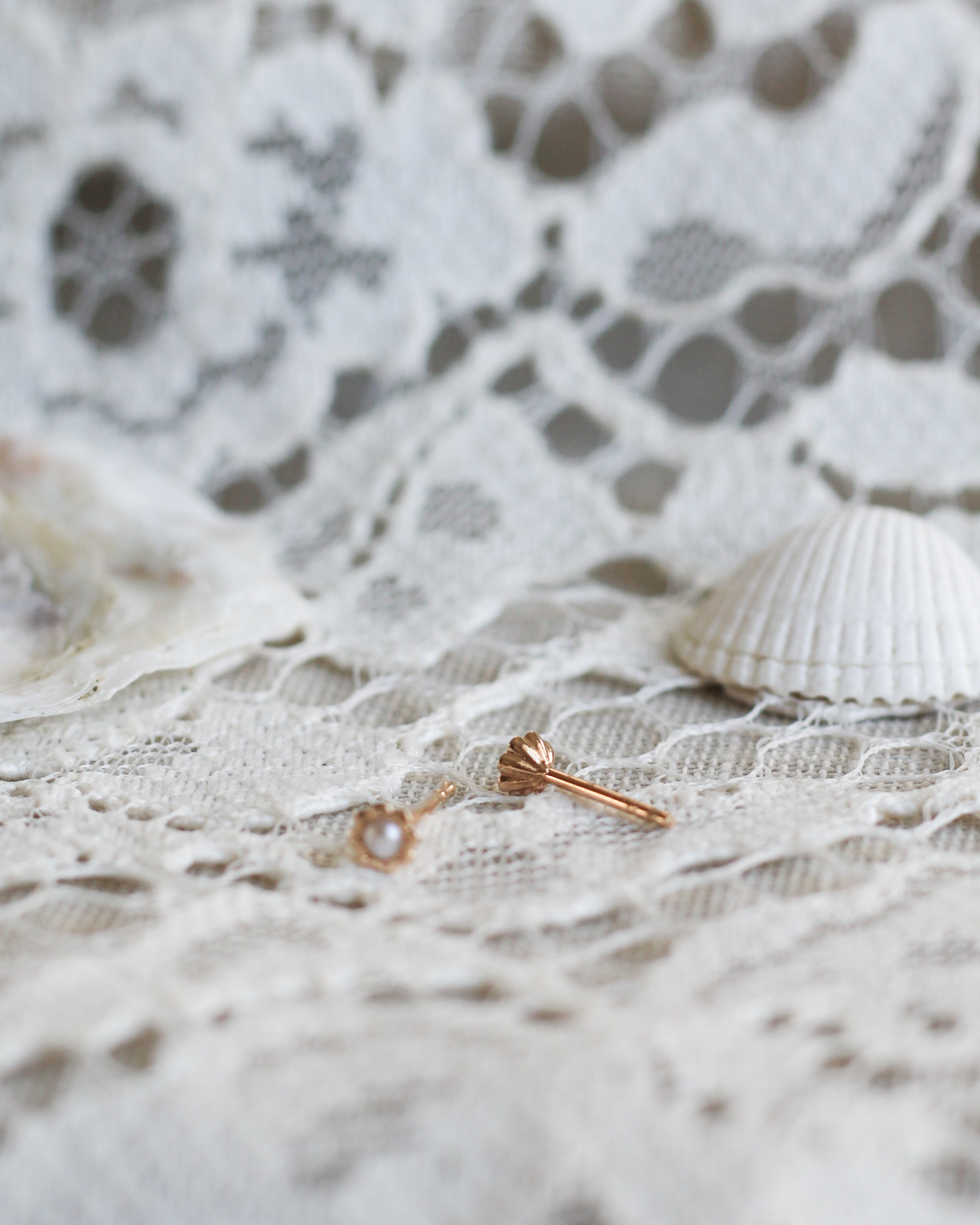 En otroligt vacker stud med snäckformade gulddetaljer och en skimrande sötvattenspärla, att bära ensam eller som en del av en rad med flera örhängen.