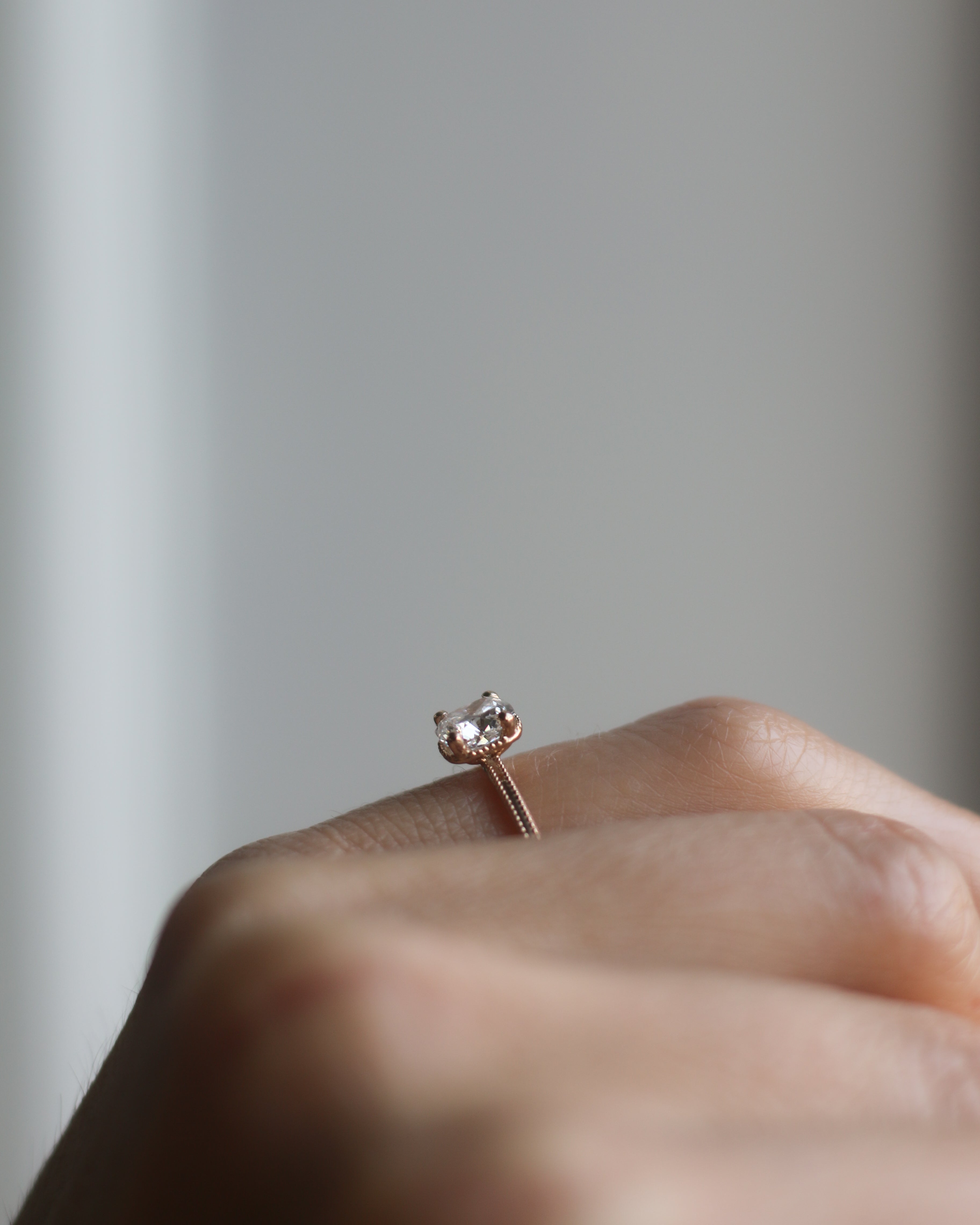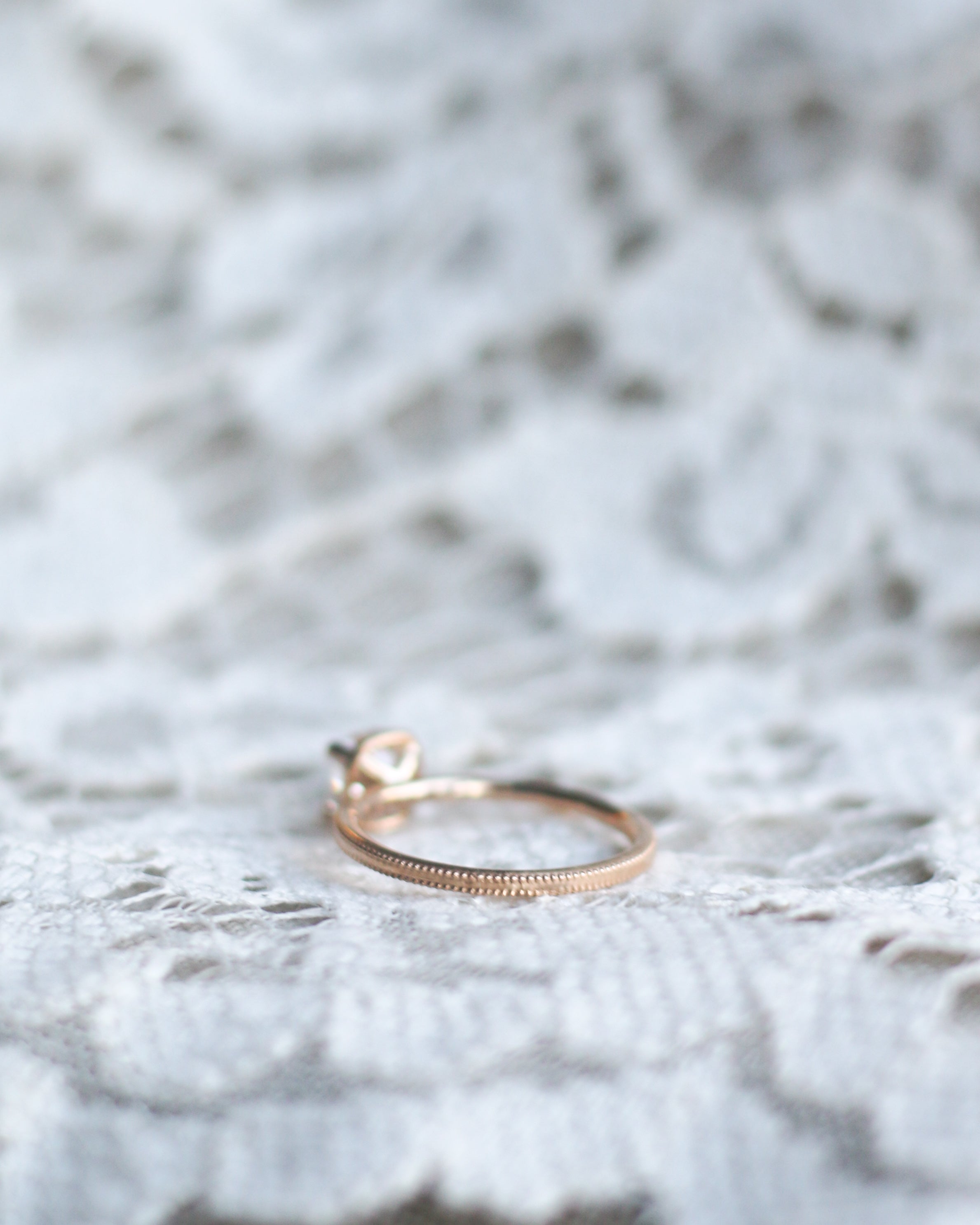 The wonderful decoration with small gold dots (milgrain) gives a subtle shimmer to the thin ring band. The milgrain decoration was common in jewelry around the turn of the last century (18-1900).
