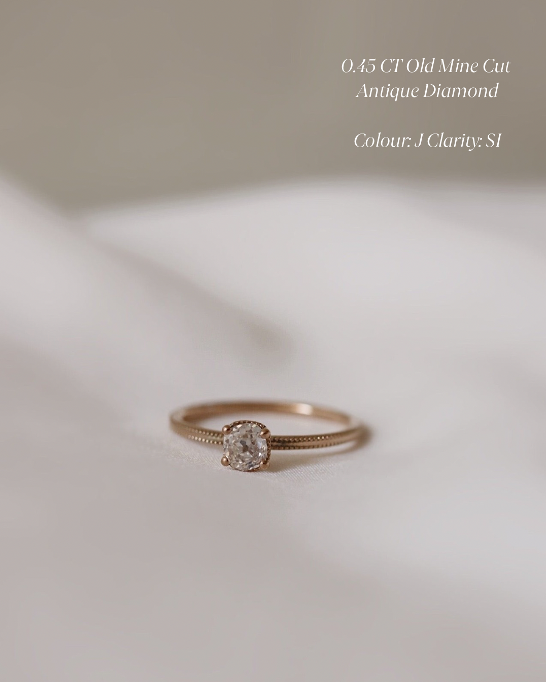 The cut of the diamond is called the Old Mine Cut, a beautifully shaped cut that preceded the modern cushion cut!
