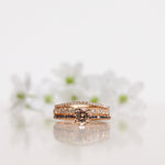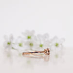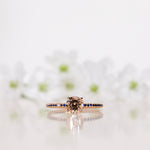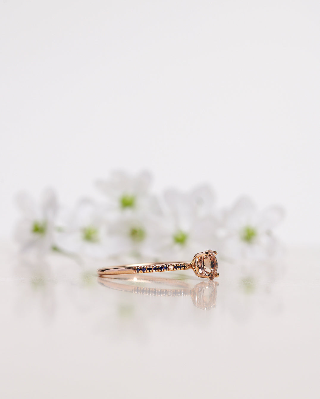 - Low Classic Solitaire Sparkle Ring with Champagne Morganite and Dark Blue Sapphires