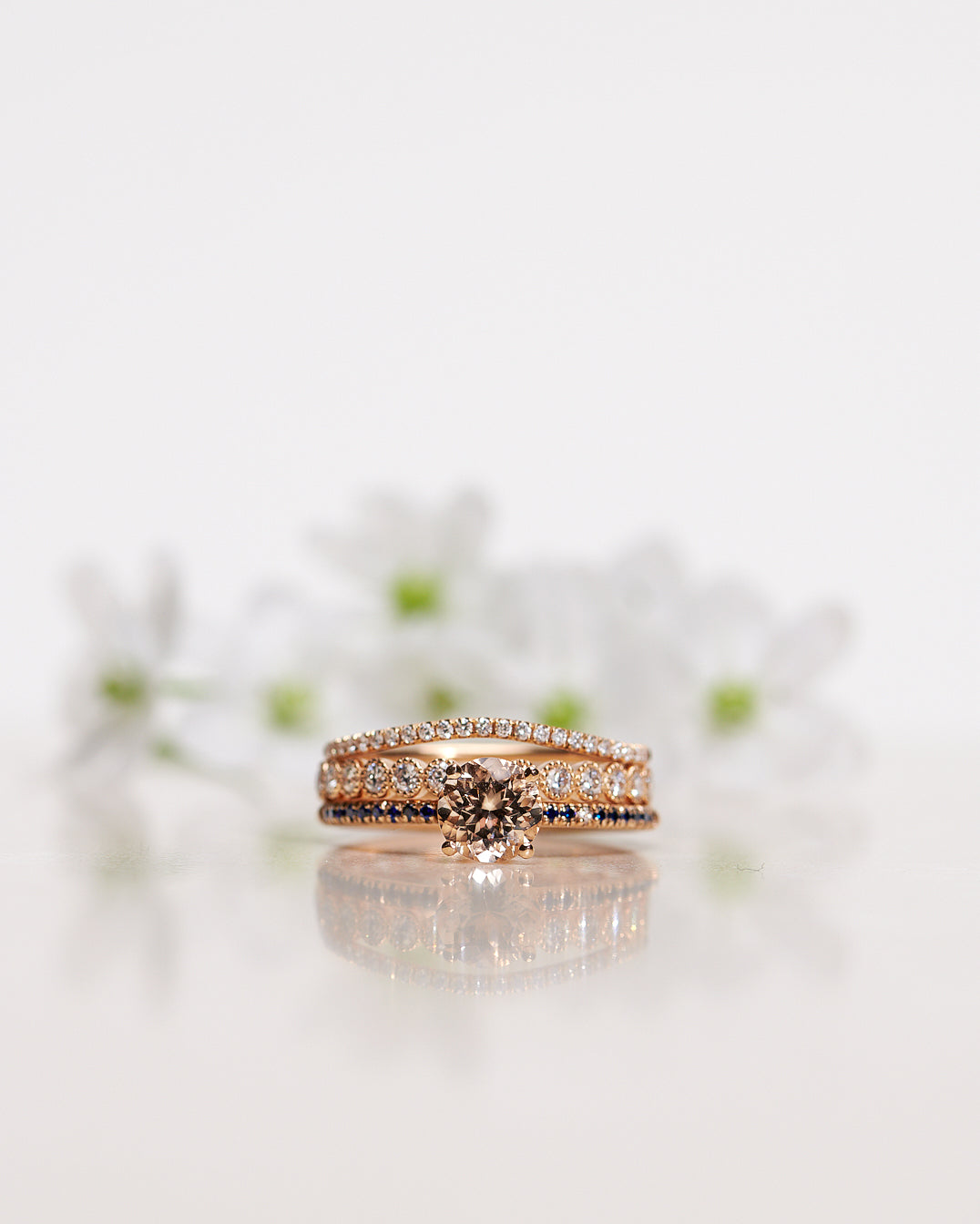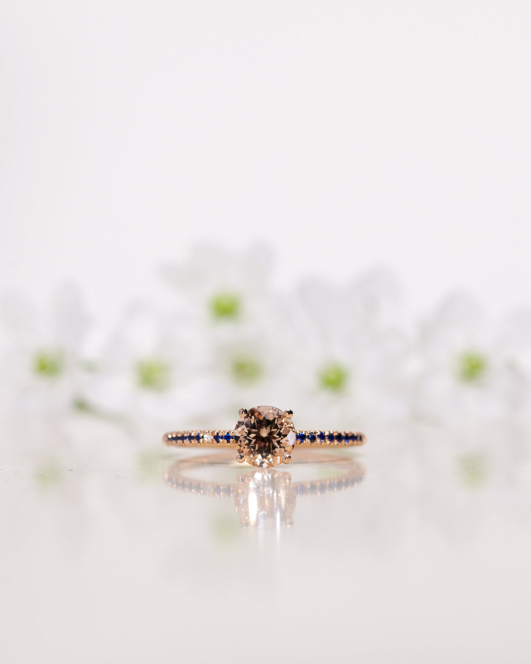Finished: Low Classic Solitaire Sparkle Ring with Champagne Morganite and Royal Blue Sapphires