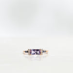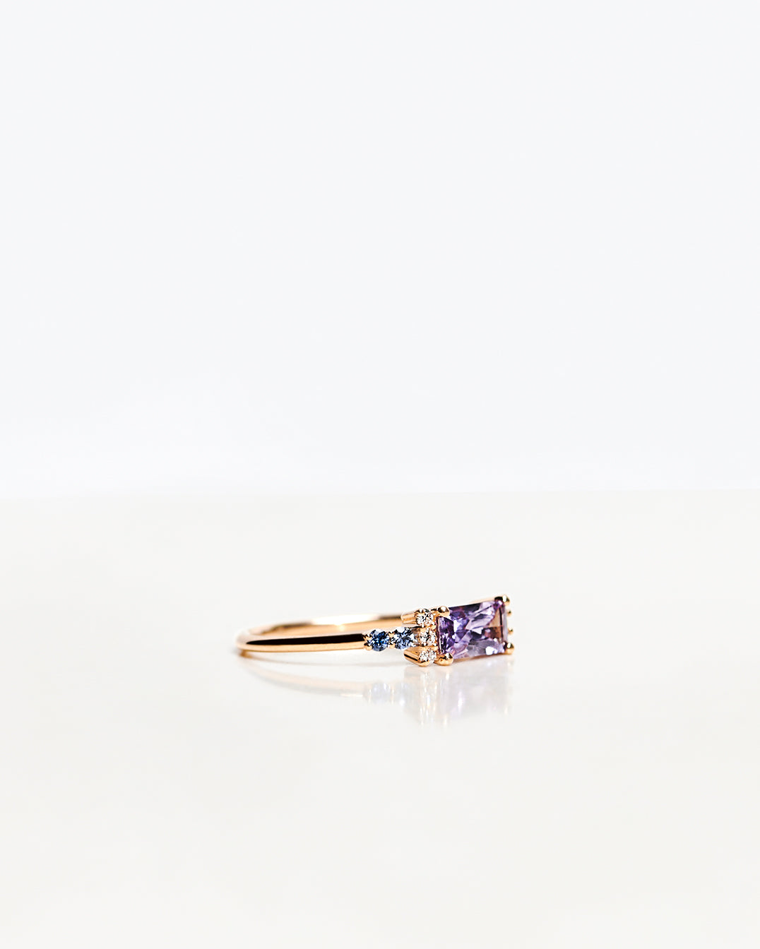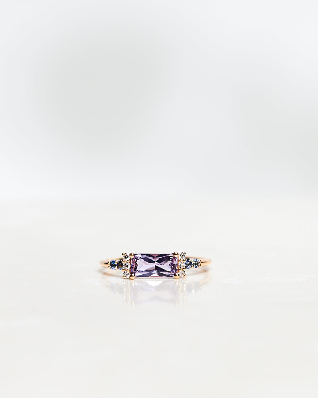 A unique, one-of-a-kind cluster ring featuring a 1 CT repurposed natural lavender sapphire from Tanzania, four light blue natural brilliant sapphires from Sri Lanka and six brilliant diamonds.
