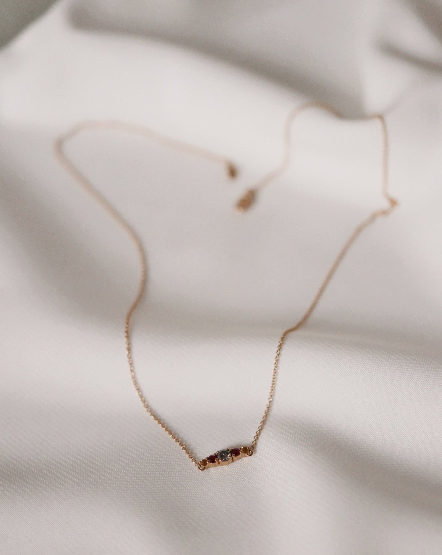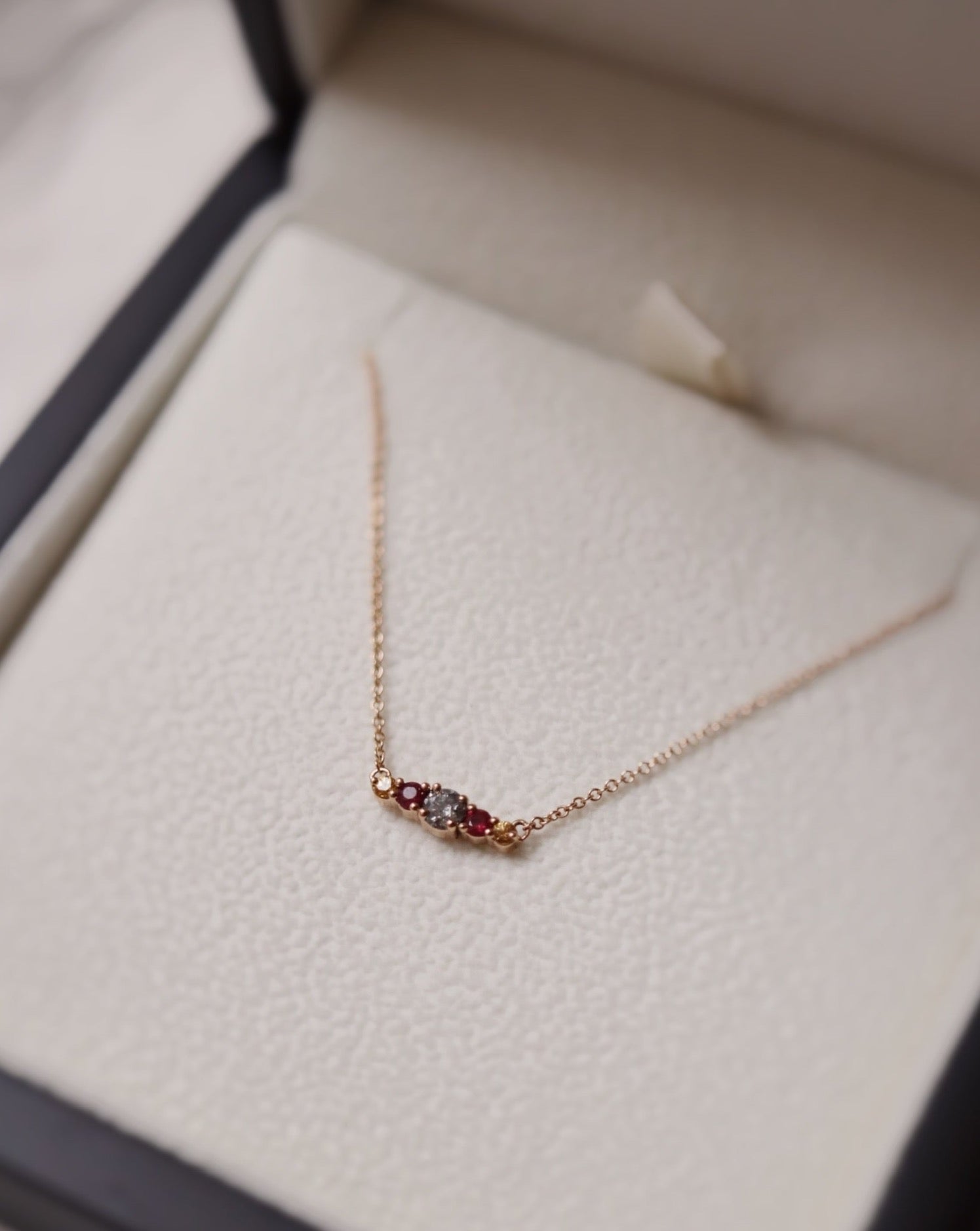 A custom necklace with a seemingly bold choice of gemstones. In fact, they all represent part of her family: