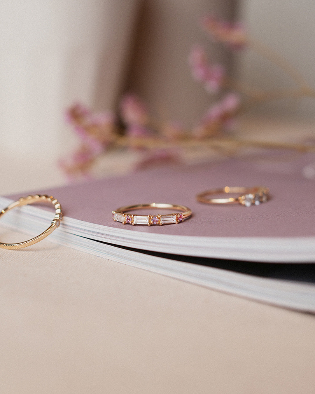 This gorgeous ring comes with baguette-cut diamonds and light pink sapphires in an art deco-inspired design.