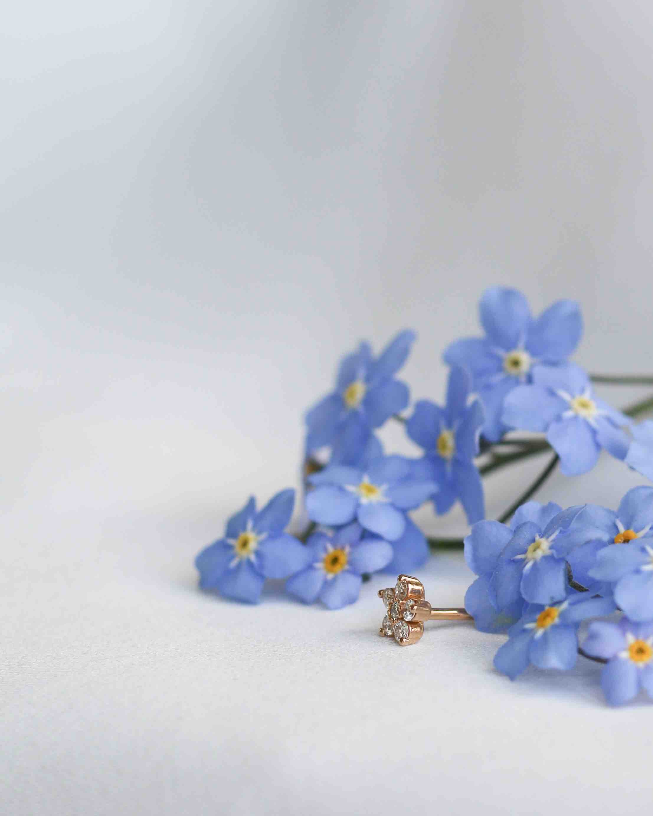Örhänget mäter 5 mm tvärs över. Tips! Om du vill prova storleken i ditt öra, klipp ut en rund pappersbit som mäter 5 mm i diameter och lägg mot örsnibben där du tänkt bära din Secret Garden Flower Stud!
