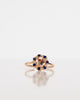 The champagne morganite measures 6 mm in diameter (approx 1.20 CT) and is surrounded by 14 smaller gemstones – seven dark blue sapphire brilliants and seven white diamond brilliants.