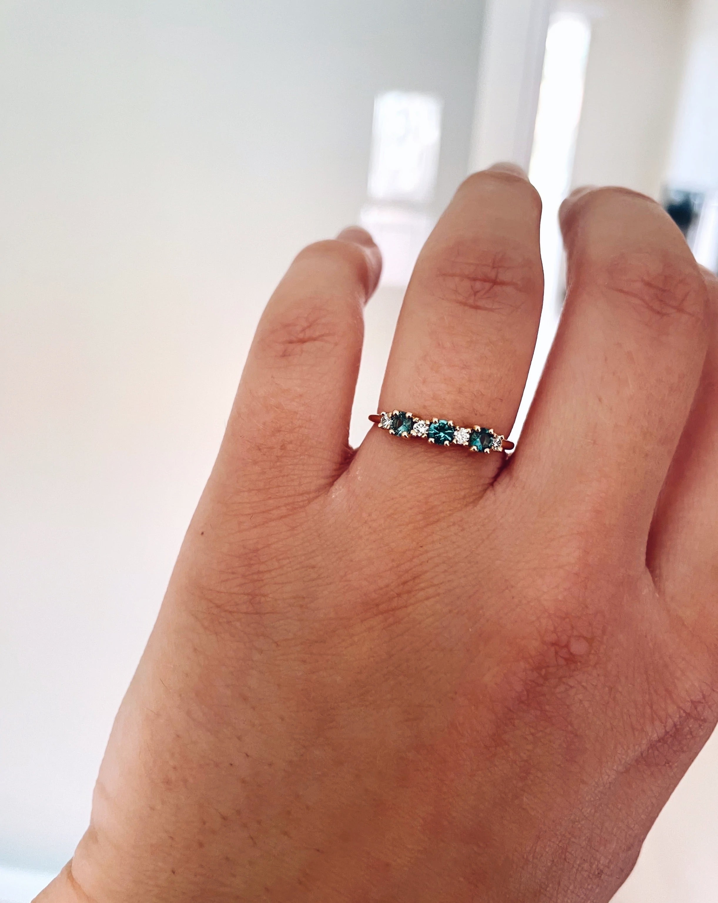 Finished: Brigitte Ring with Sea Blue Tourmalines and Diamonds