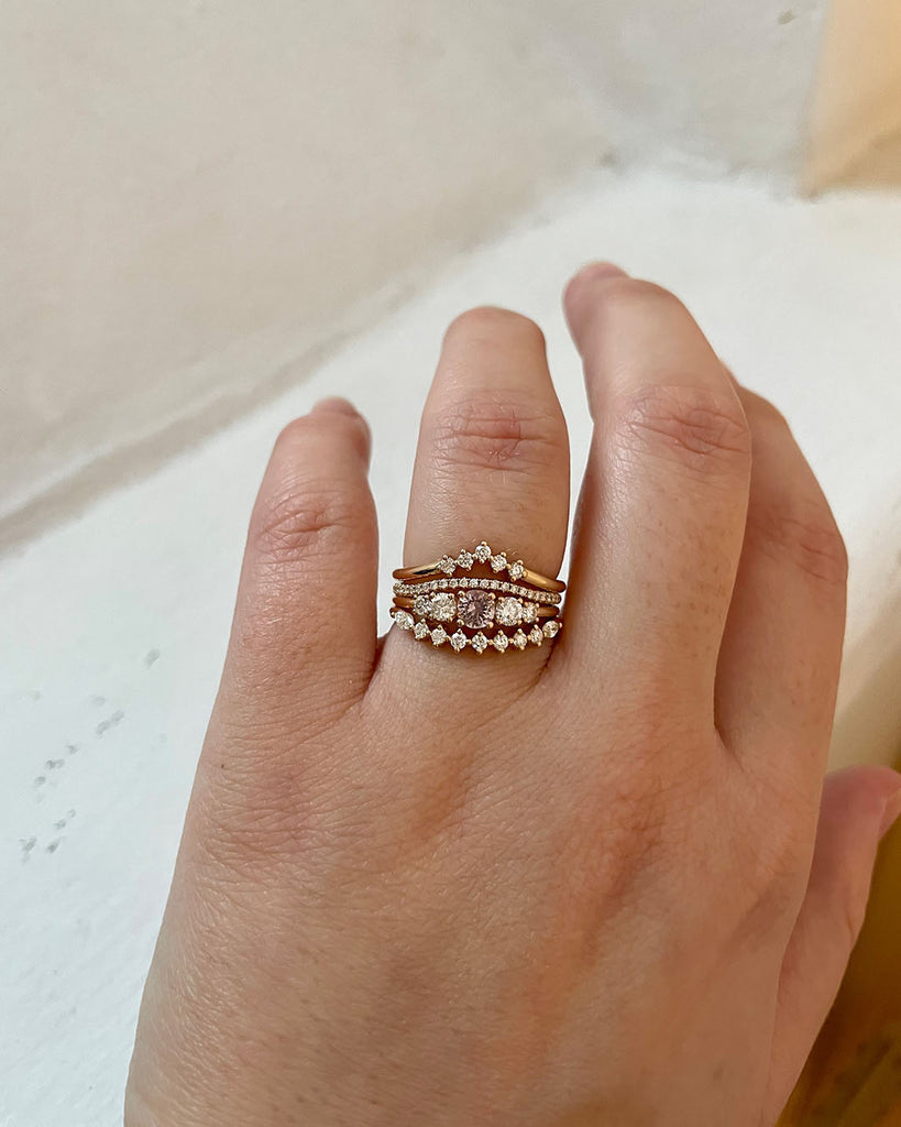 Elise Ring looks amazing alone on the ring finger. It also stacks beautifully with all curved bands.
