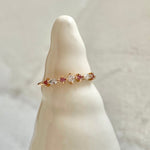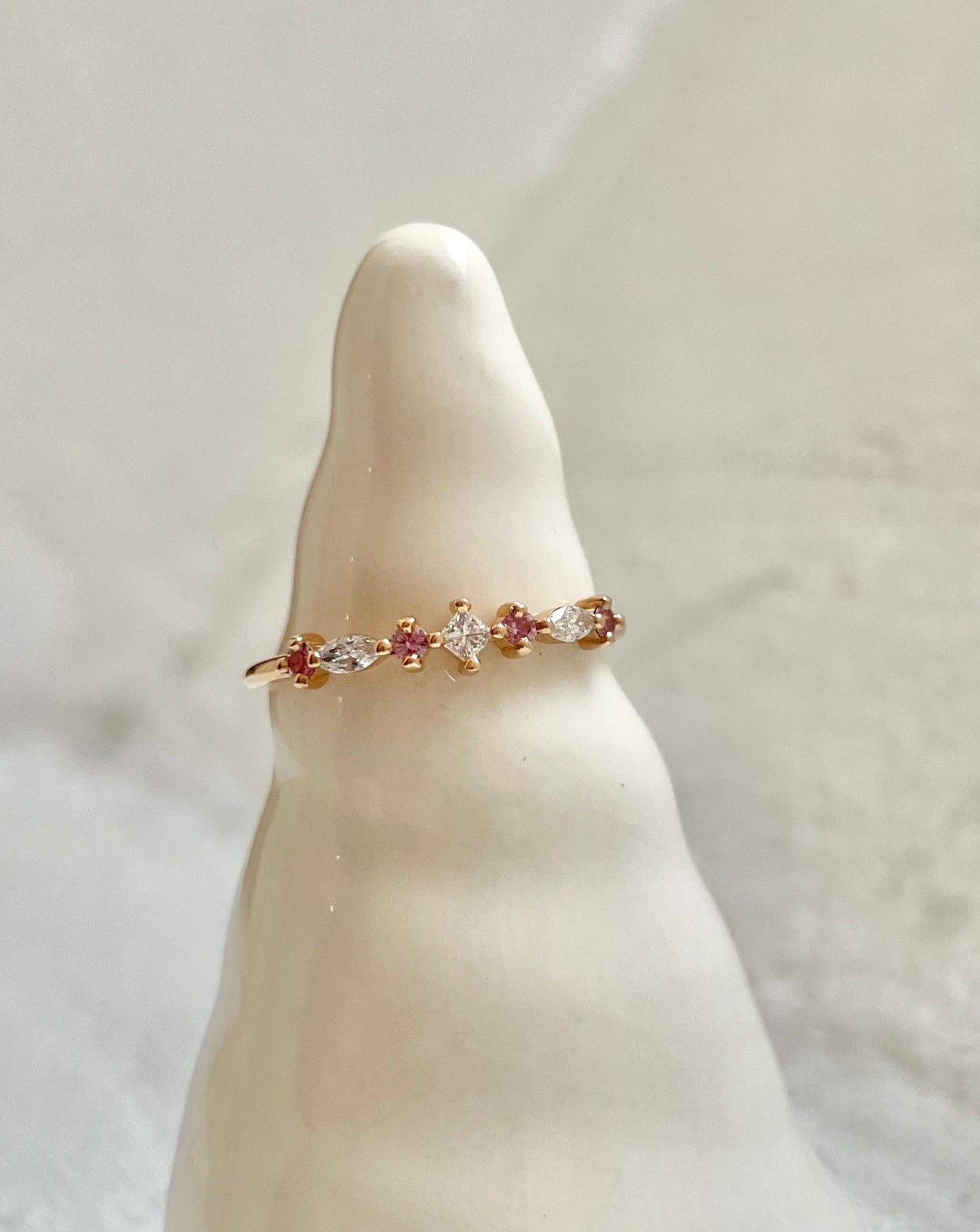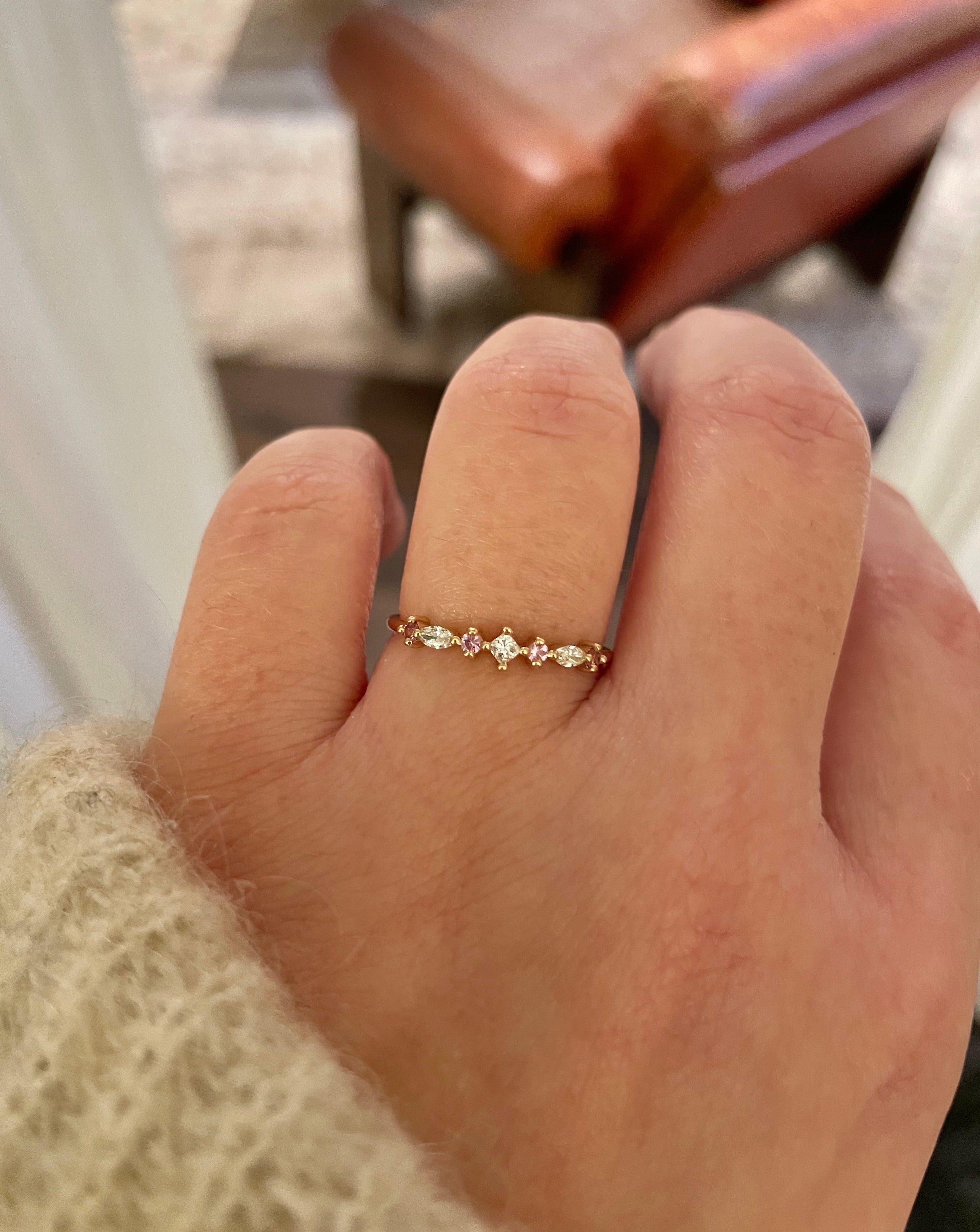 Hilda is a stunning ring with a lovely vintage feel. The design combines three different cuts: Princess cut (squared), Marquise cut (boat-shaped) and Brilliant cut (round) gemstones. This gives the ring a unique, playful look - that is even more enhanced by the four small, light pink sapphires that we have set in this special version of Hilda Ring 💗