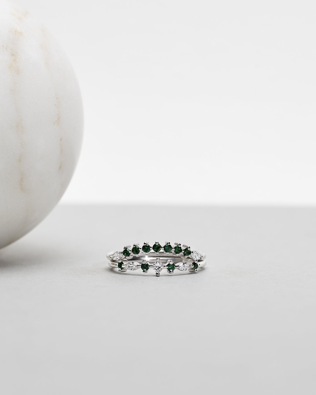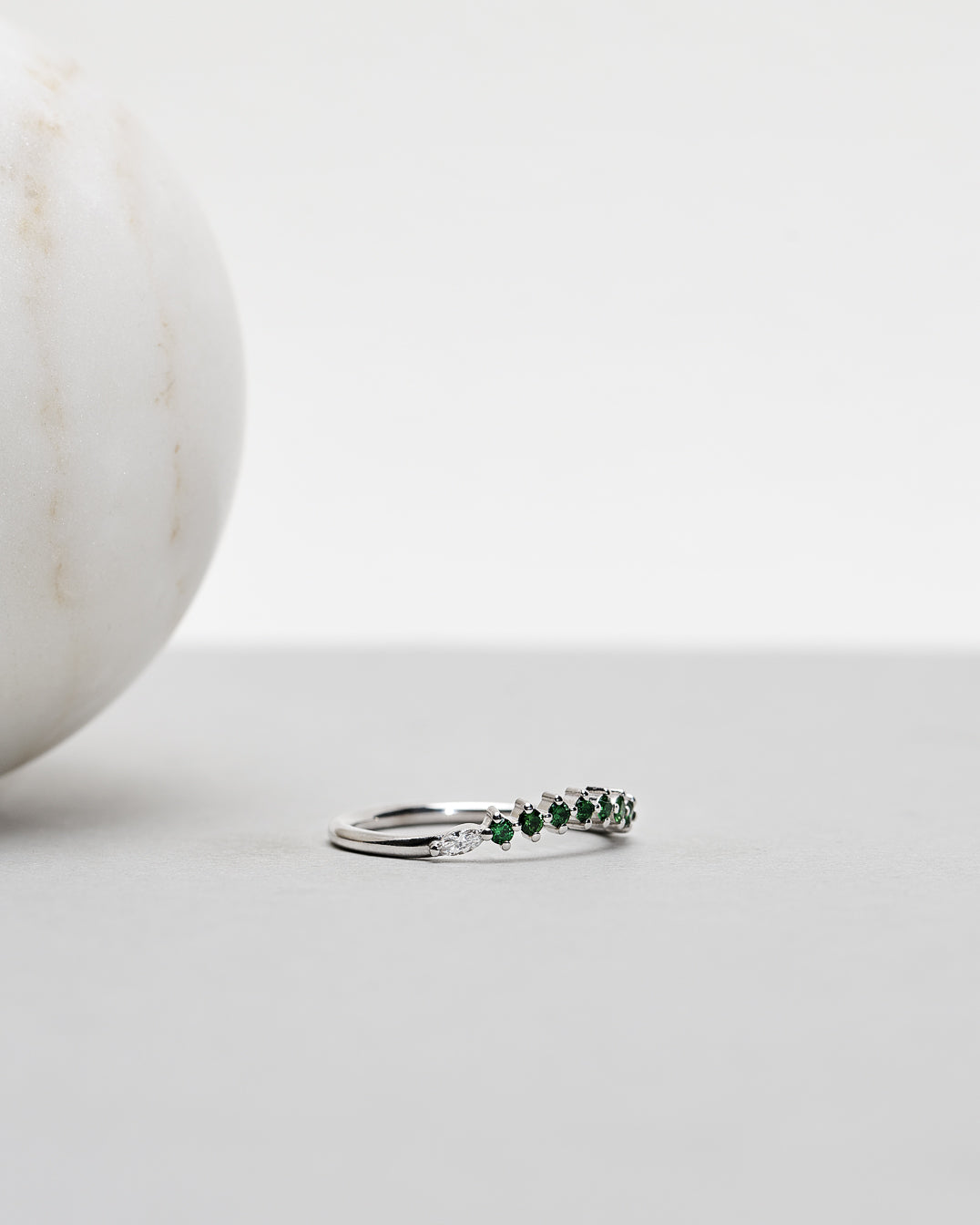The design of Idun Curved Diamond Band combines two different stone shapes for a stunning, vintage look. This white gold version features a combination of dark green tourmalines and white diamonds.
