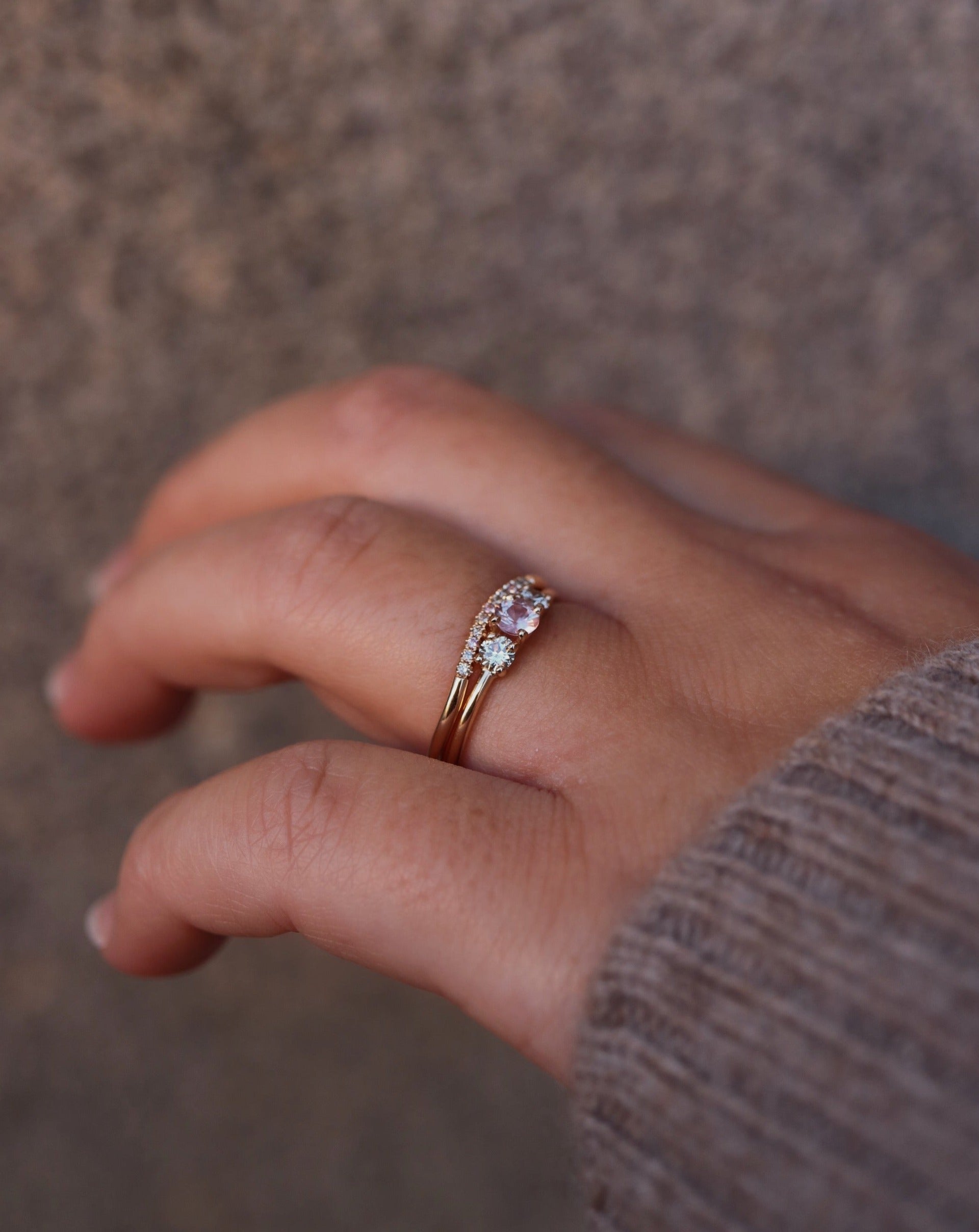 This beautiful version of Jade Petite Wave Enough Ring combines soft, light pink sapphires and sparkling champagne diamonds in a stunning 2+1 pattern.