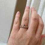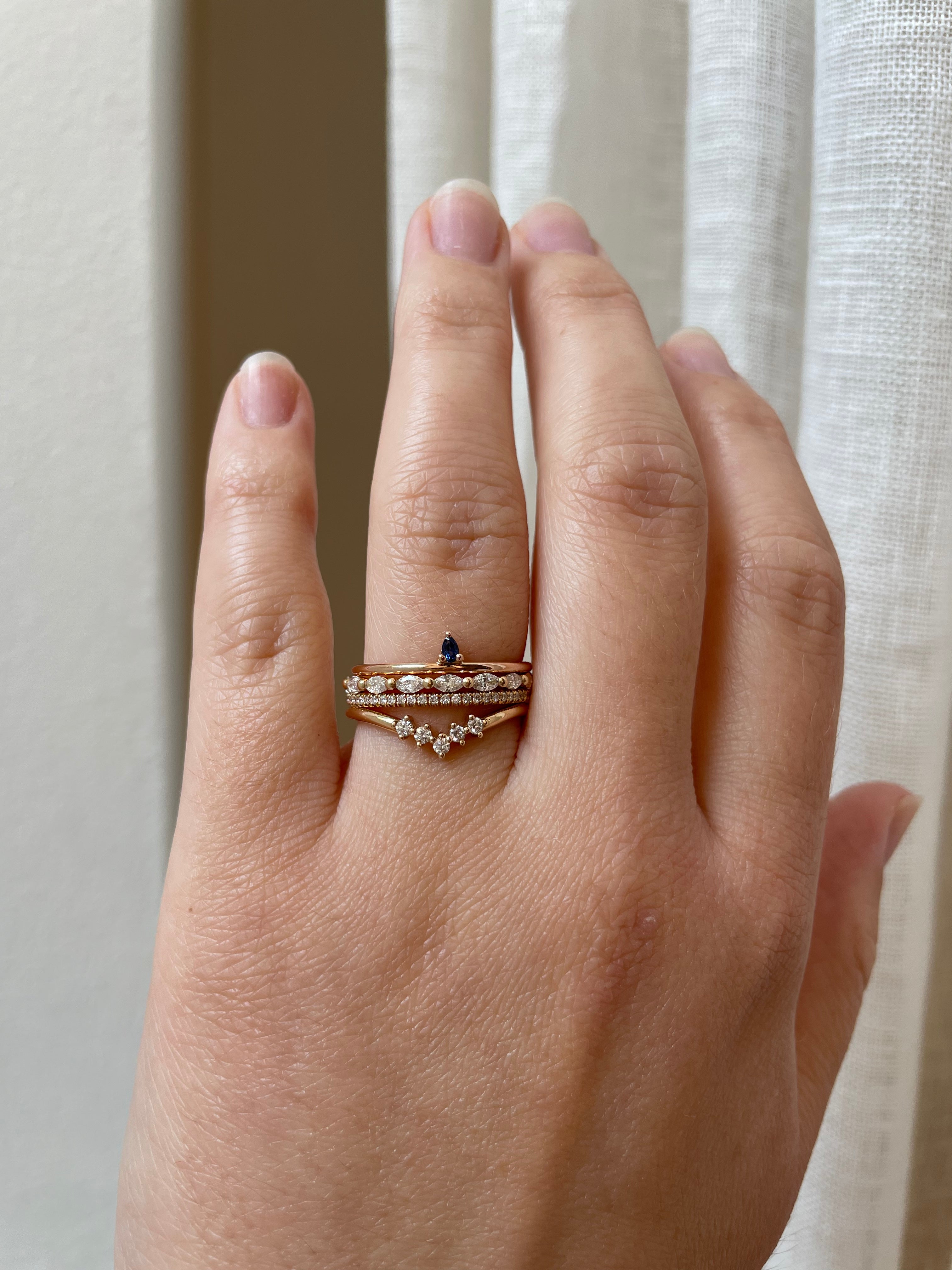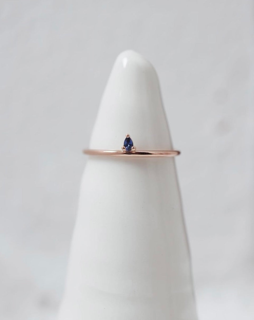 In this ring we have used a dark blue sapphire drop that perfectly compliment the soft rose gold color of the band.