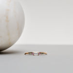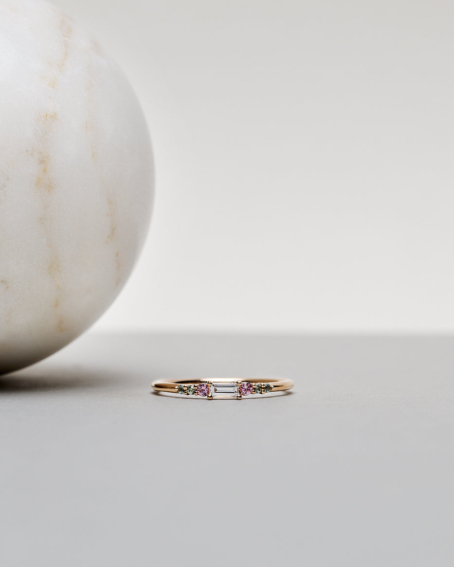 One approx. 0.10 CT (4x2 mm, can weigh up to 0.12 CT) Baguette-cut Diamond TWVS, two 1.7 mm (approx. 0.02 CT) Light Pink Sapphires and Four 1.25 mm (approx. 0.01 CT) Olive Green Sapphires.