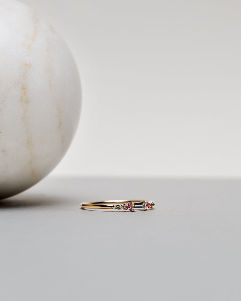 This charming mini cluster ring features an approx. 0.10 CT baguette diamond and sapphires in a lovely color combination.