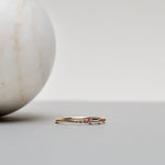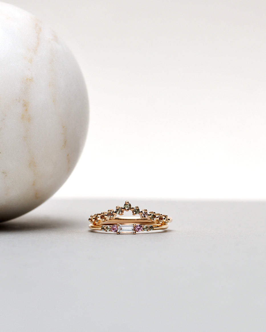 This ring is beautiful worn alone on the ring finger or middle finger. It also stacks wonderfully with a curved band or a thin gold band.