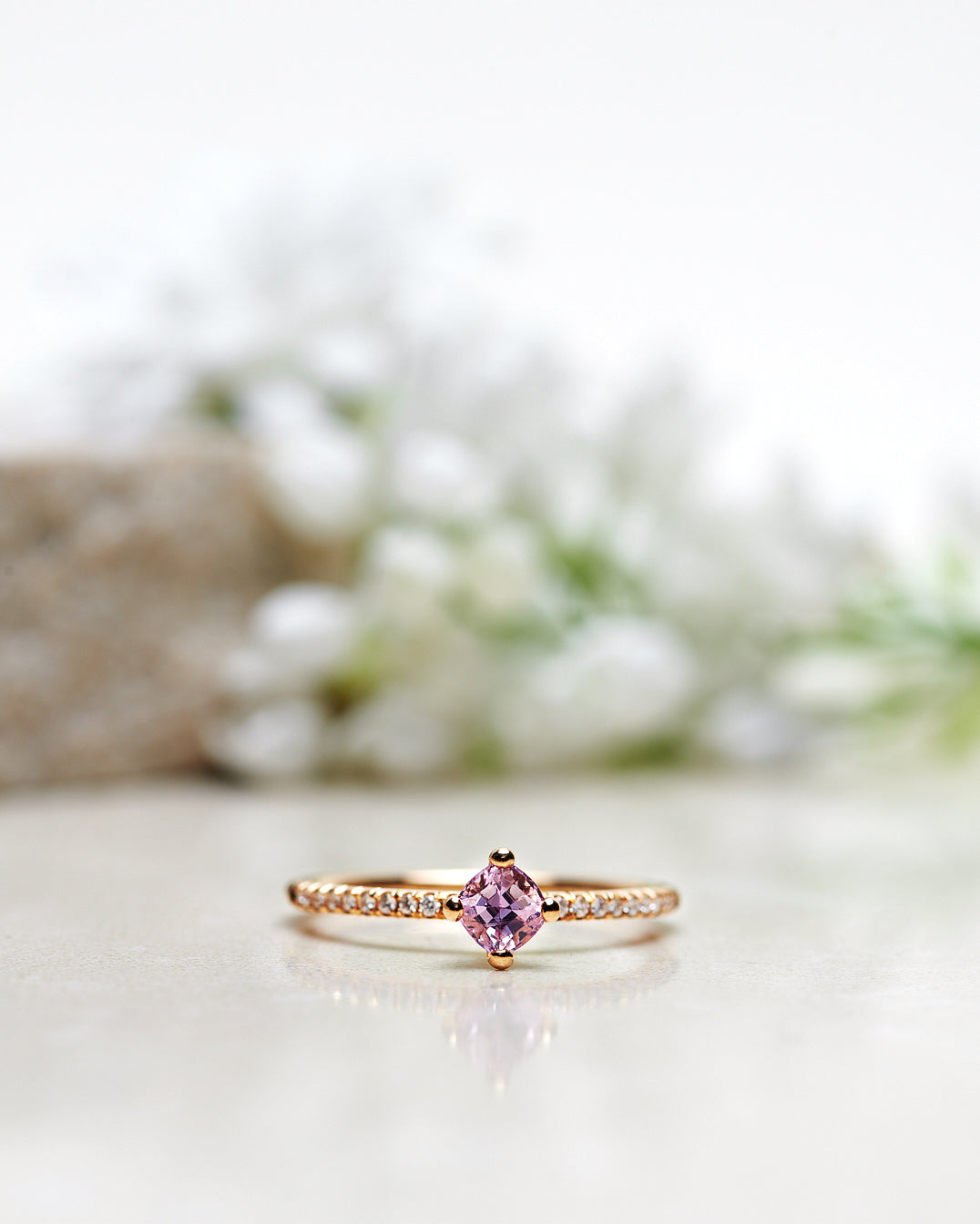 - Not At All Tiny Sparkle Ring with a Squared Cushion Cut Pink Sapphire and Diamond Sparkle