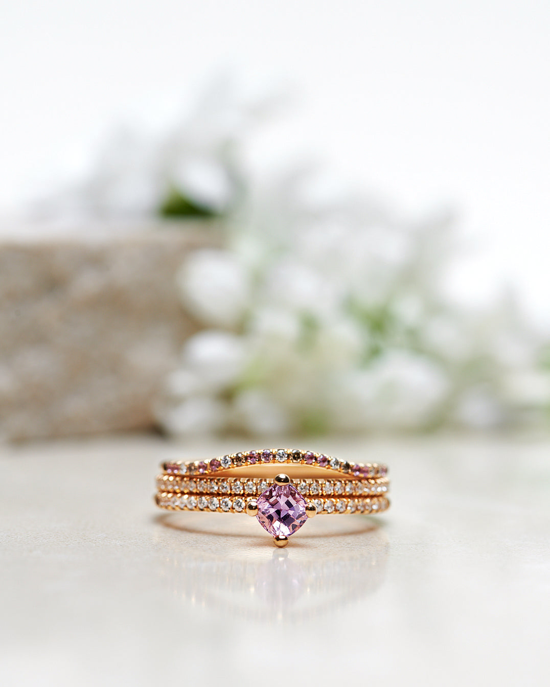 A signature mumbaistockholm ring loved by everyone! Here featuring a unique squared cushion cut light pink sapphire together with twenty small diamonds. The perfect mix of soft pink and sparkling diamonds!