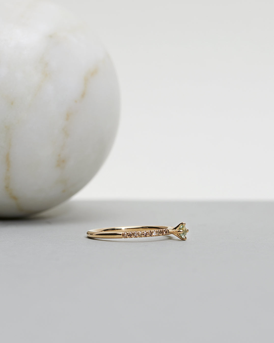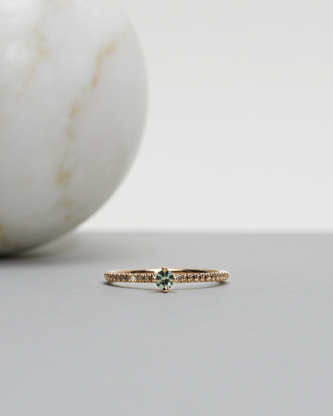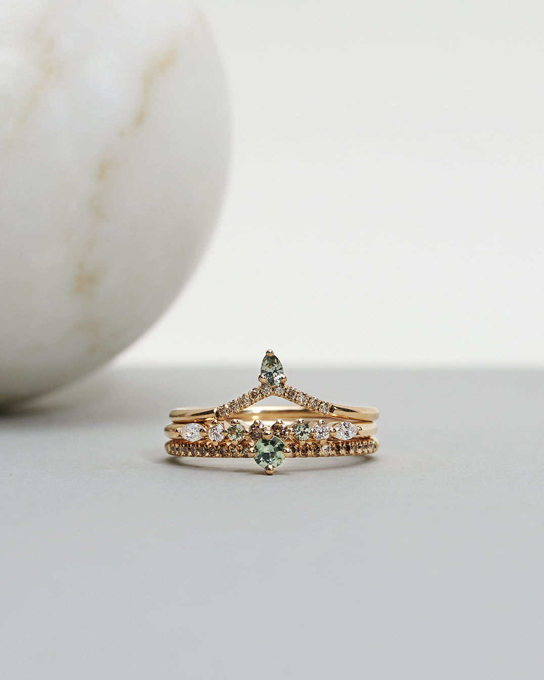 In this version we've used a rare olive green sapphire combined with chocolate diamonds and one white diamond for a soft sparkle. Olive green and chocolate has for a long time been one of our most popular color combinations, and we can really see why!