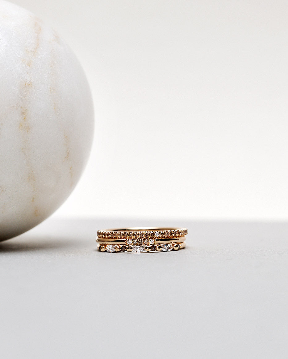 This ring looks amazing alone on any finger but it also makes a perfect stacking ring. You can stack it with most other rings from our collection.