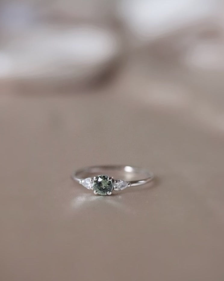 A thyme green sapphire and two drop diamonds, clear as water drops. A unique engagement ring for a down-to-earth mumbai girl in Gothenburg. So beautiful! I want a herb garden and the sea on my finger too. Thank you for letting us create this ring for you Hanna. ♡